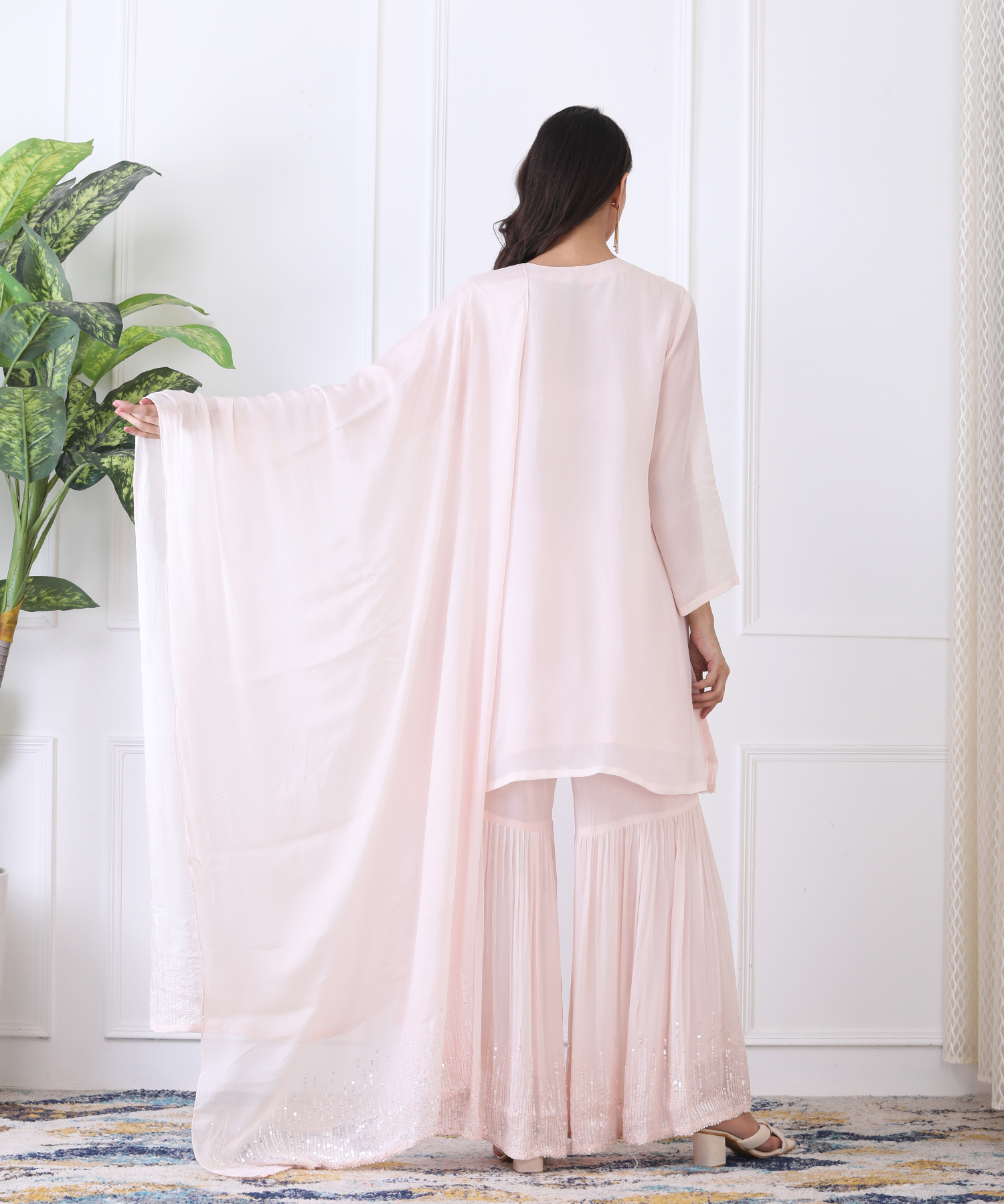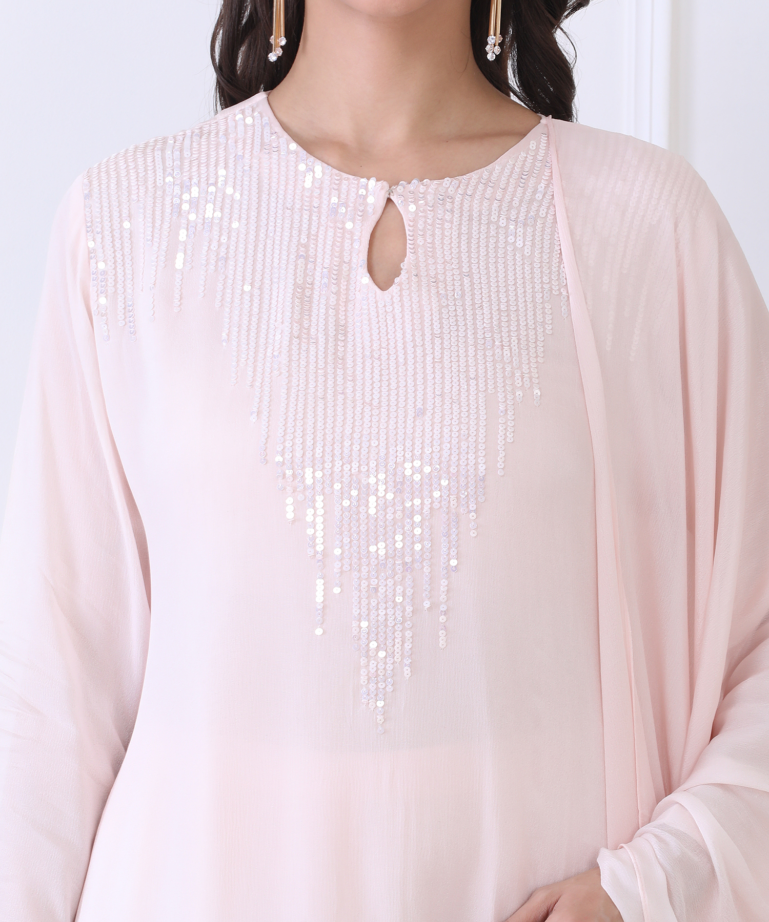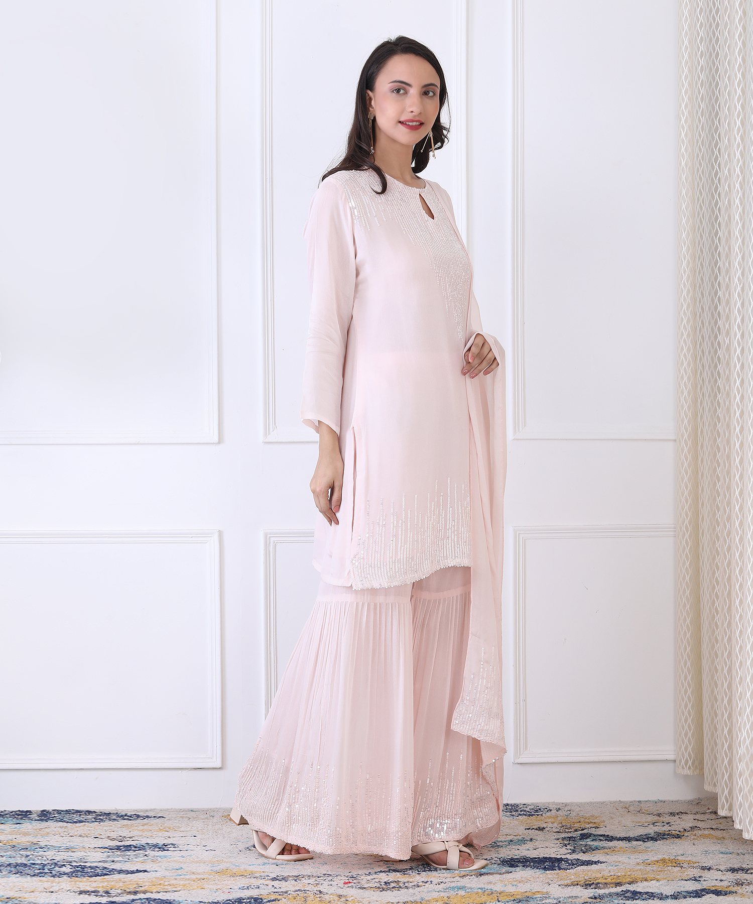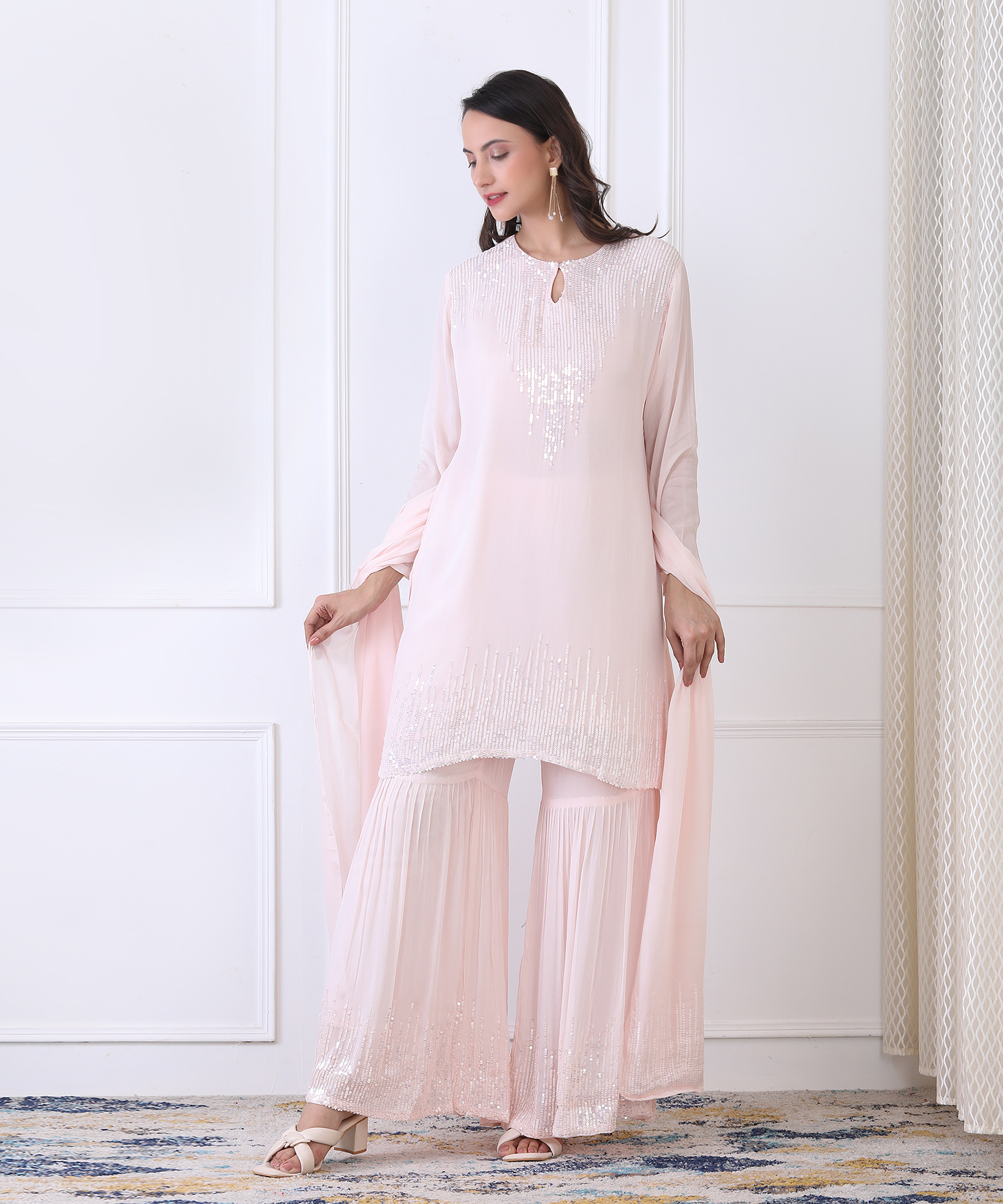 Baby Pink Chiffon Suit Set with Sequin-Embellished Short Kurti