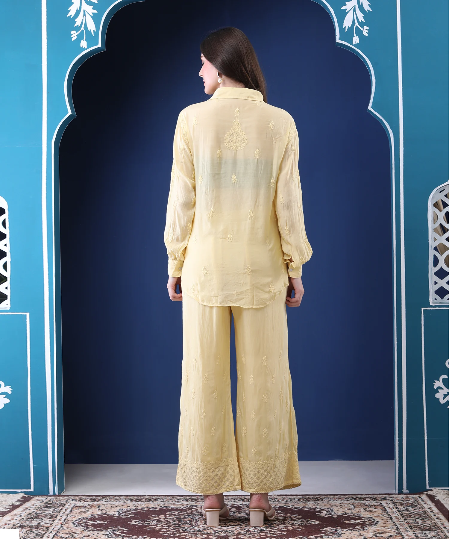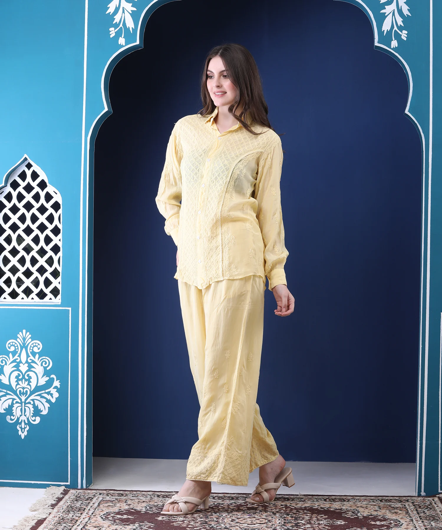 Introducing the Pastel Yellow Co-ord Set, a perfect fusion of chic design and timeless comfort. Crafted from unbelievably soft mulmul, this light-as-air ensemble is your new go-to for effortless style. The relaxed shirt and coordinating plazzo are embellished with meticulous chikan hand embroidery and delicate crochet detailing, adding a layer of artisanal charm. It’s a versatile look that feels as good as it looks, transitioning seamlessly from a casual outing to an elegant get-together.