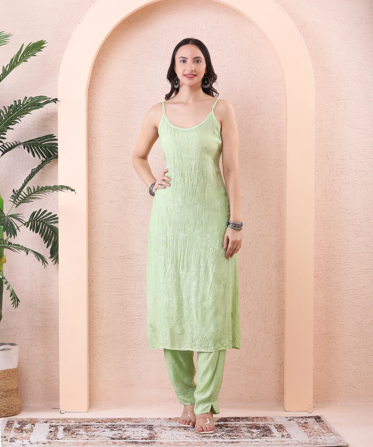 Less is truly more with our Pista Green Kurta Set, designed for the woman who values subtle elegance. The sleeveless noodle strap kurta, adorned with delicate Chikan hand embroidery, flows effortlessly for a flattering fit. The matching pants echo the same craftsmanship, bringing harmony to the entire look. Crafted in a soothing pista green, this set is perfect for summer soirées, art gallery visits, or slow Sunday brunches. Lightweight, breathable, and undeniably graceful, this is minimalism with a soul.