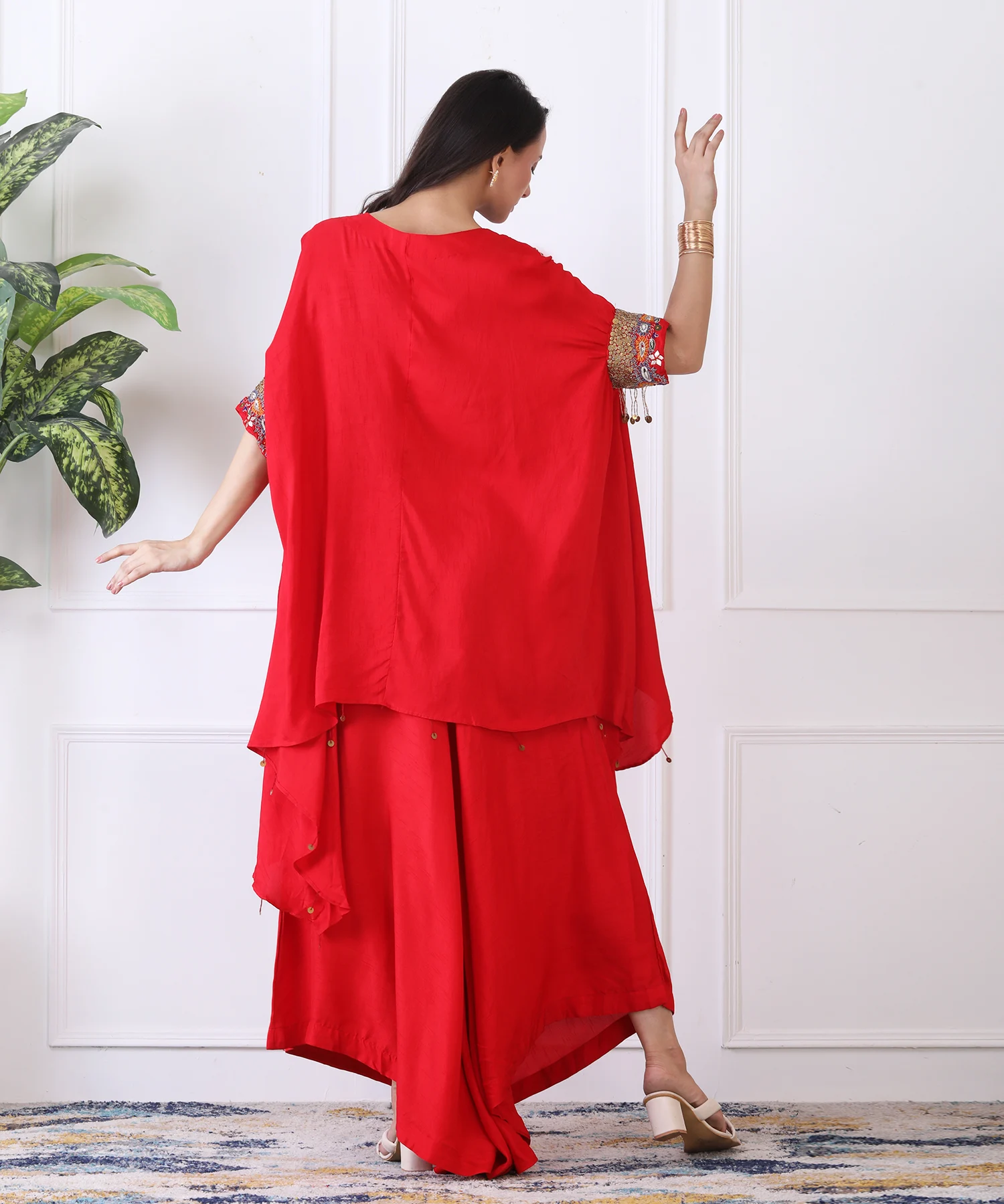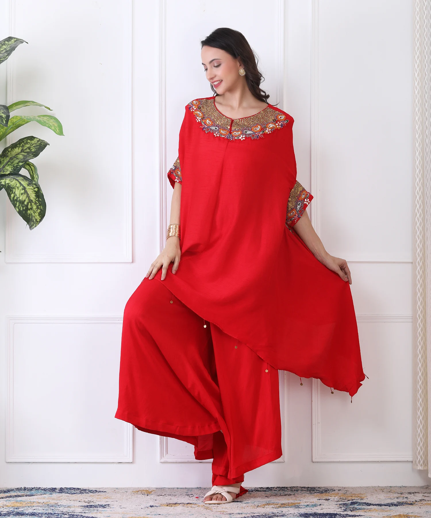 In this Red Co-ord Set, every detail is a celebration. The crape silk top shines with hand embroidery along the neckline and sleeves, where sequins and thread knots catch the light with delicate flair. The flared Plasso pants, in matching flowing crape silk, create an effortless silhouette that twirls beautifully with every step. Perfect for weddings, festive evenings, or special cultural events, this set blends traditional craftsmanship with modern design, turning you into the center of attention. With each movement, confidence and elegance radiate naturally, making it more than just a cord set—it’s a wearable story of artistry, poise, and unforgettable style.