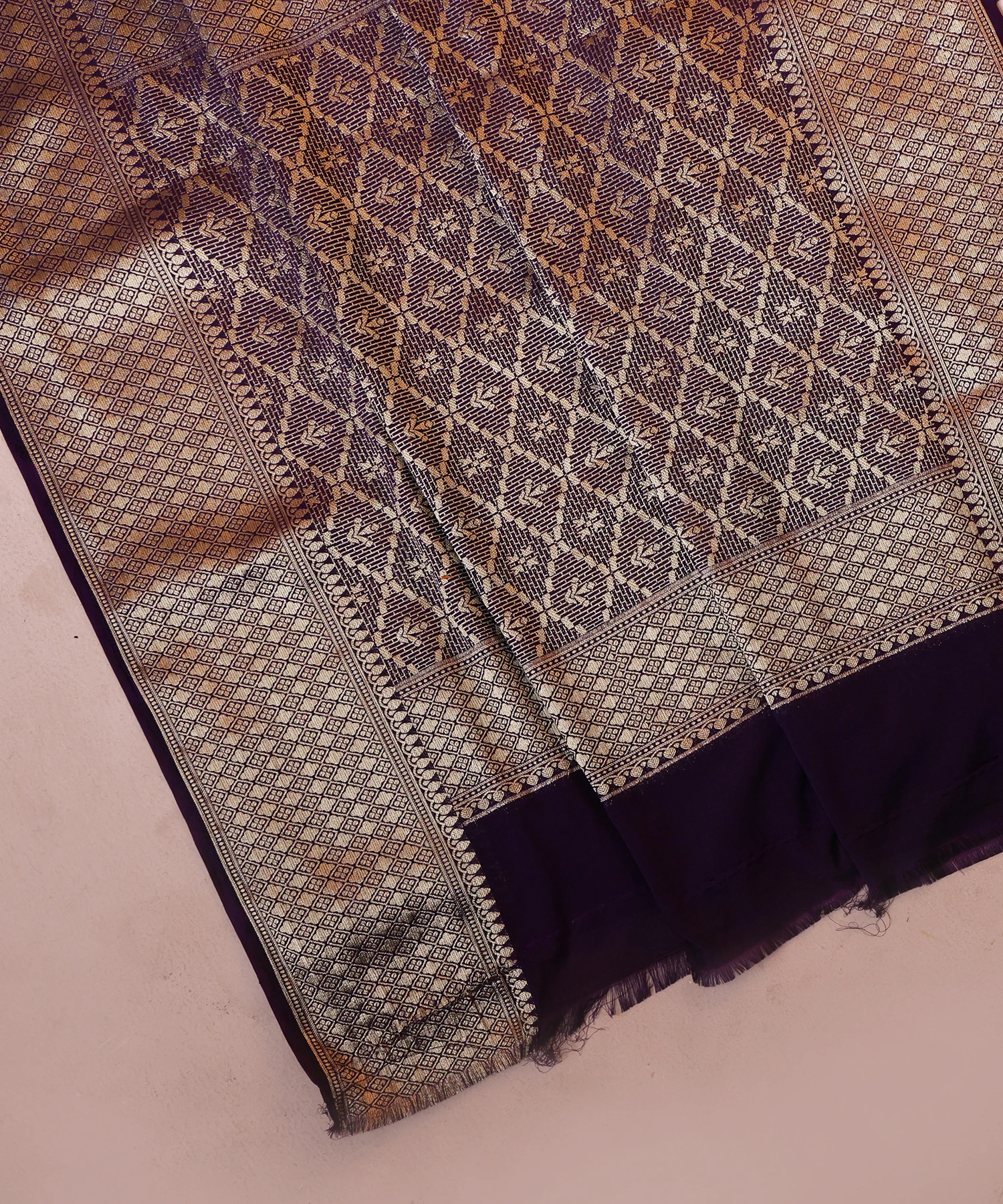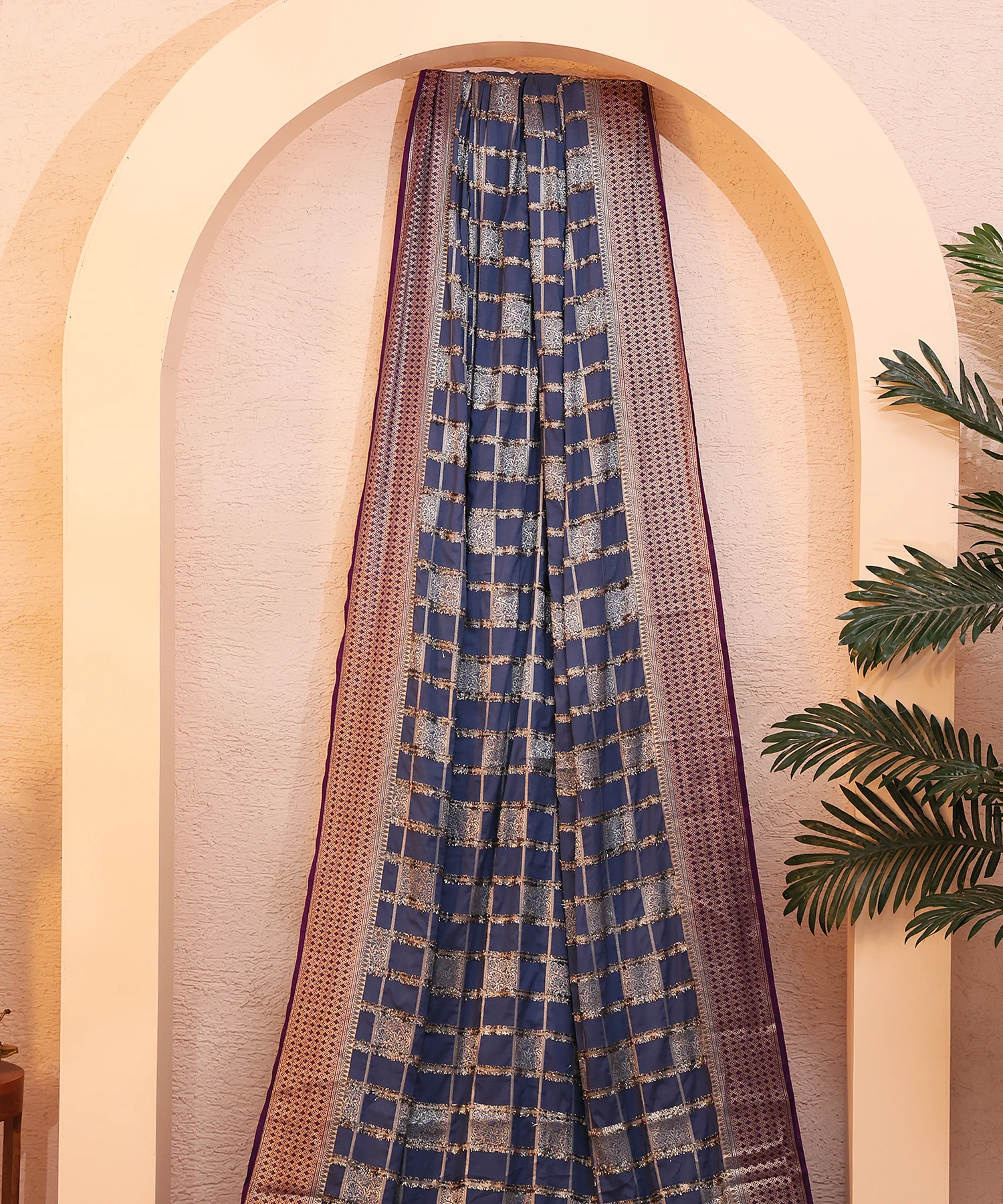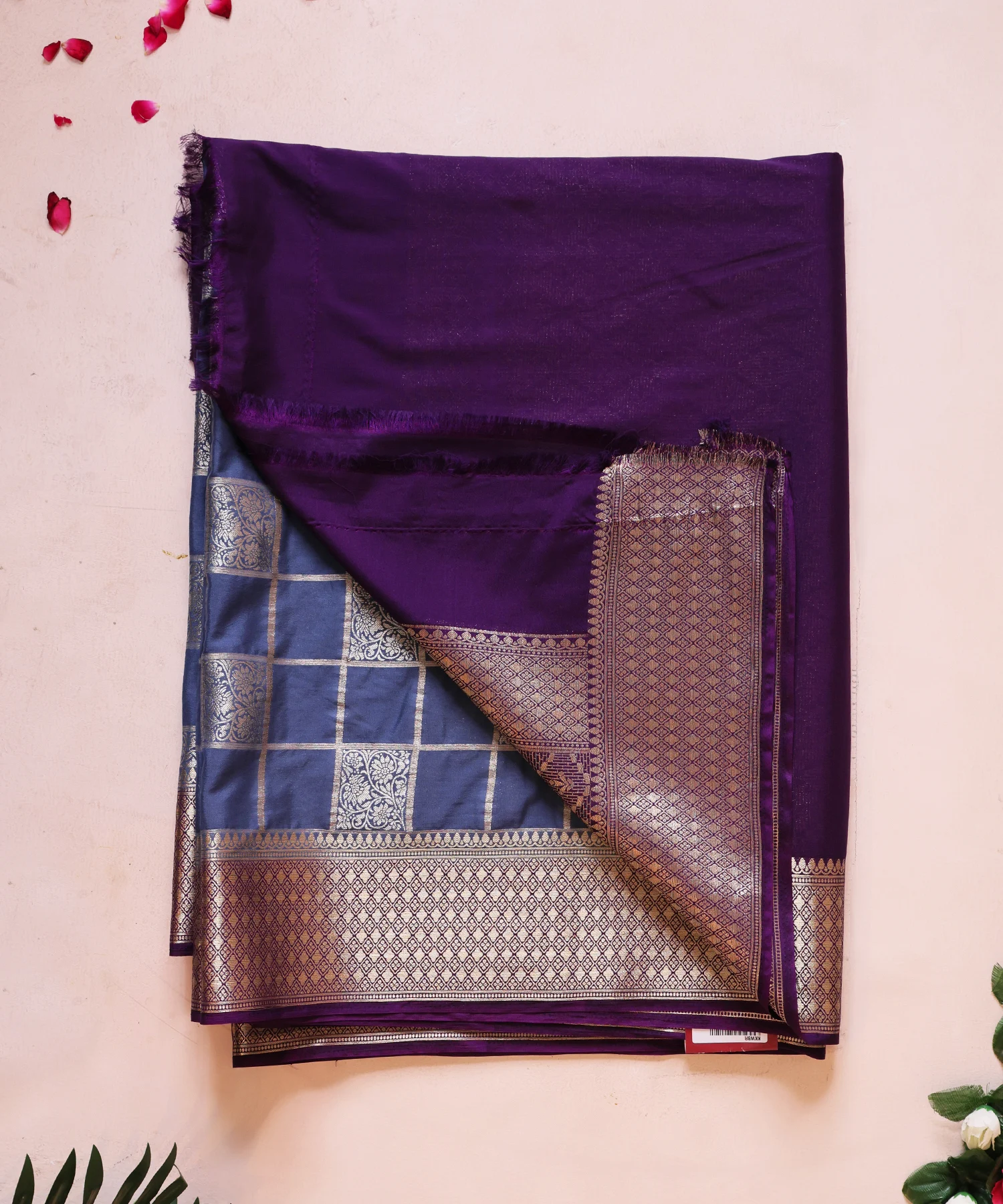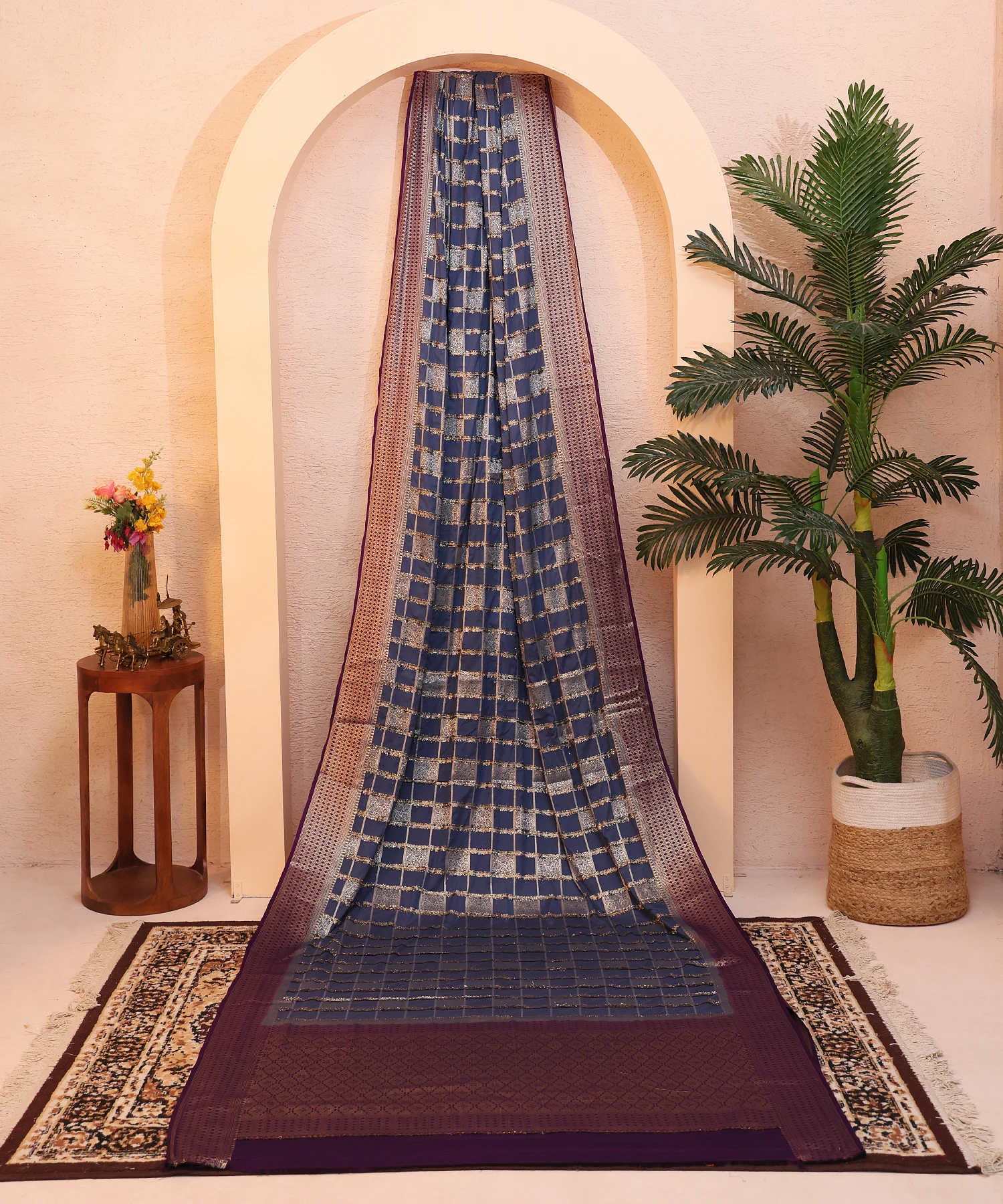 Crape silk saree in dark grey color with golden zari big checks and purple with golden zari border