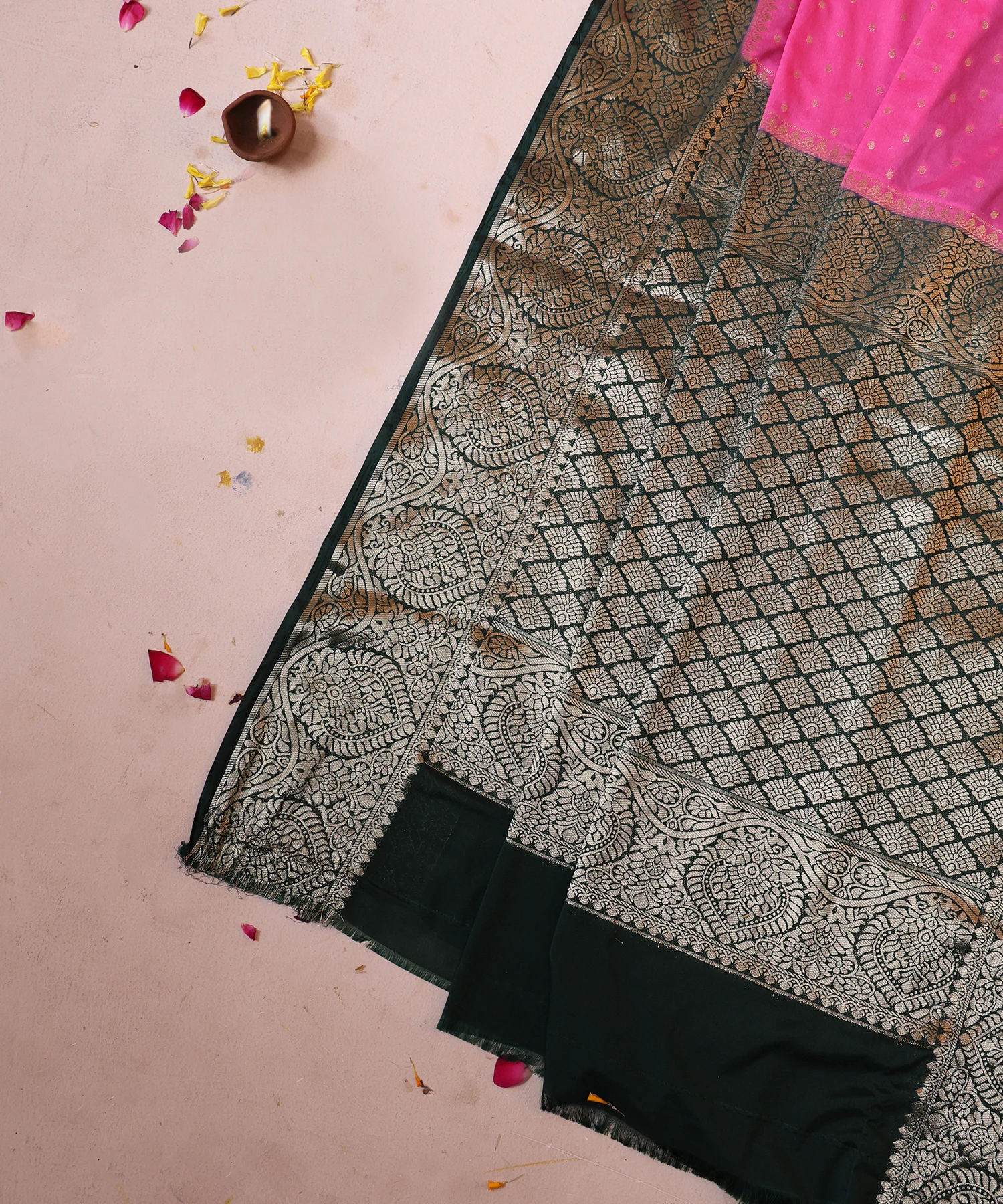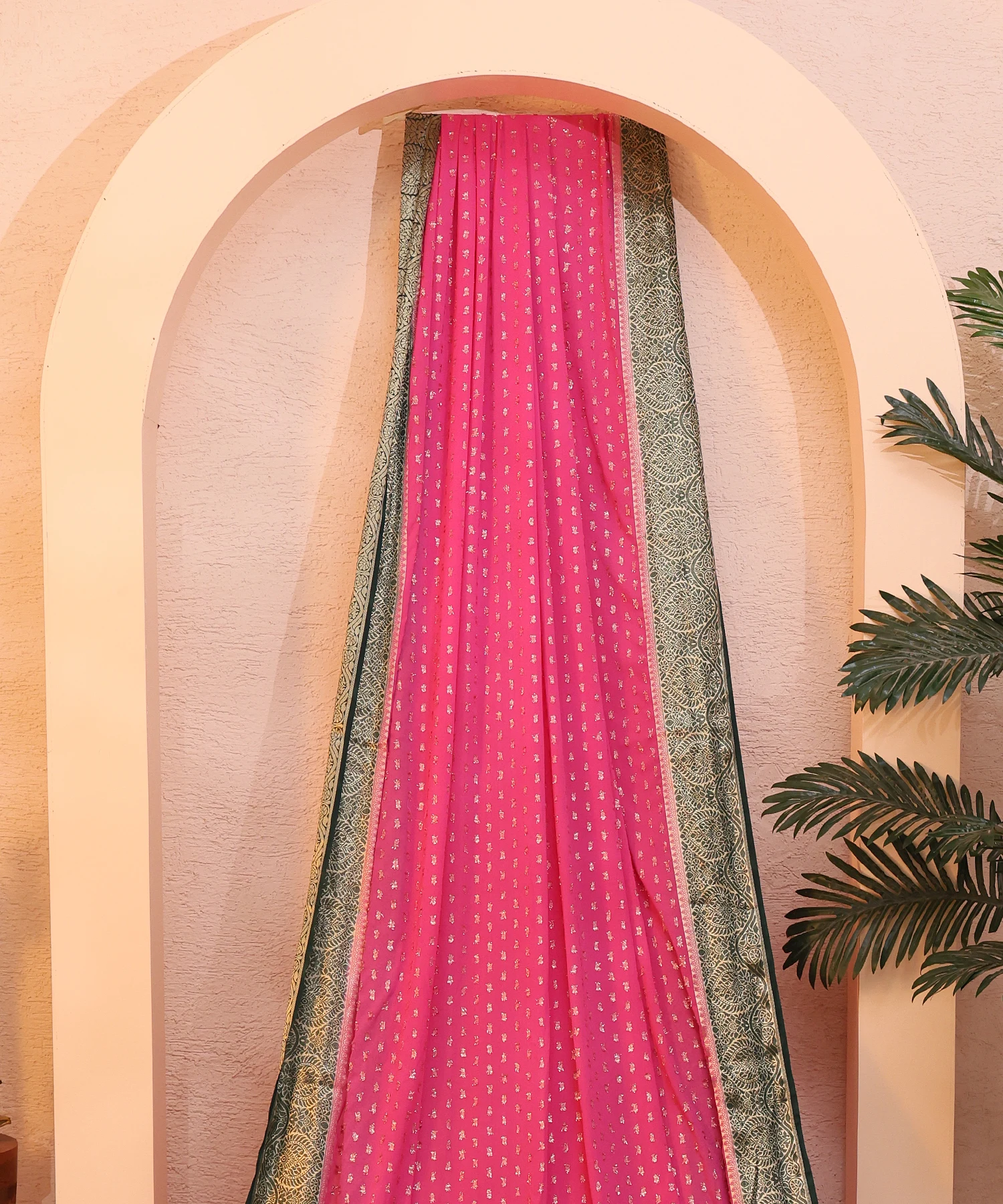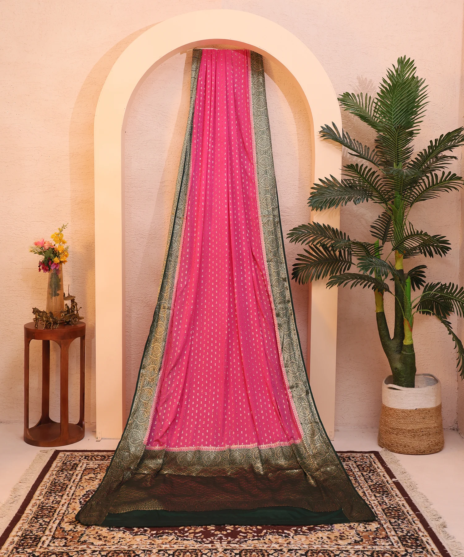 Crape silk saree in fusia pink color with small polka dots golden zari booti and emerald green border with golden zari work