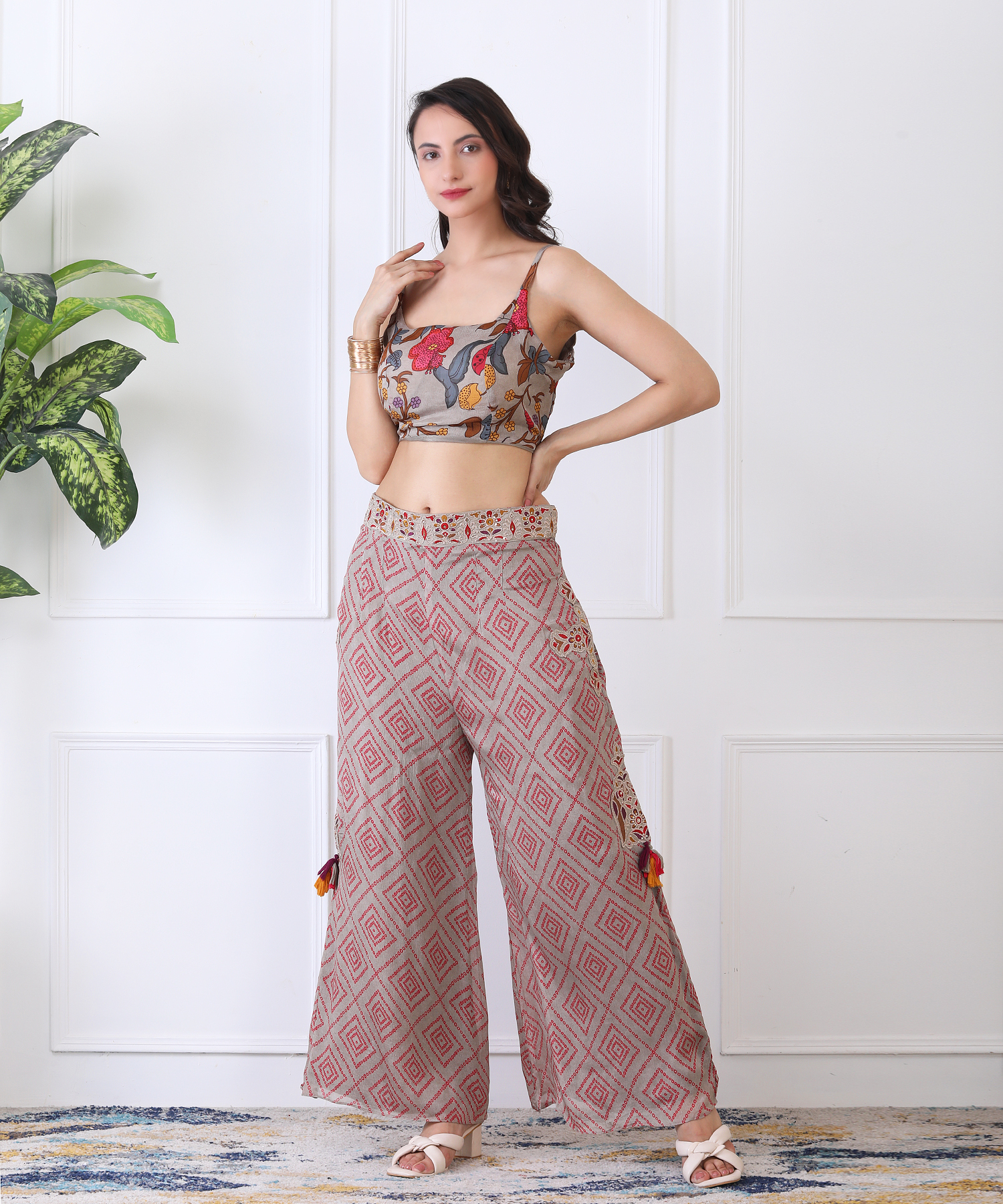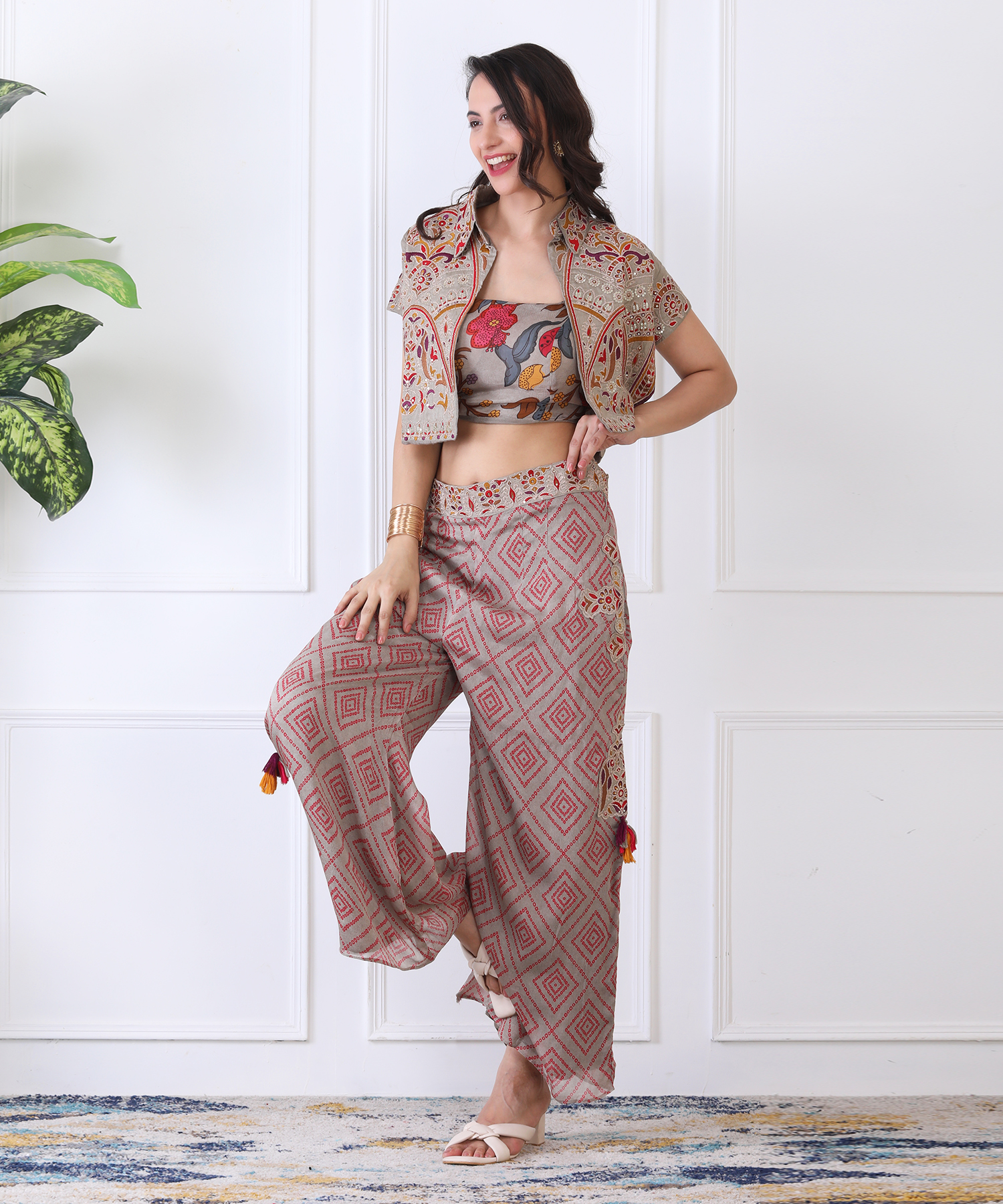 Enjoy the beauty of celebration dressing with this stunning 3-piece cord set. The silk jacket glistens with thread and sequin embroidery, exuding luxury and poise. Combined with a chiffon crop top with subtle digital prints, it sets off contemporary, lightweight elegance. Grey Bandhani-print chiffon palazzos flow effortlessly, with embroidered patchwork on pockets, sides, and belt, delivering handcrafted detail. Perfect for weddings, parties, or celebratory nights, this outfit blends comfort, fashion, and handmade artistry. Each detail is carefully crafted to add poise, confidence, and sophistication, making it a show-stopping outfit blending tradition and modern fashion in perfect harmony.