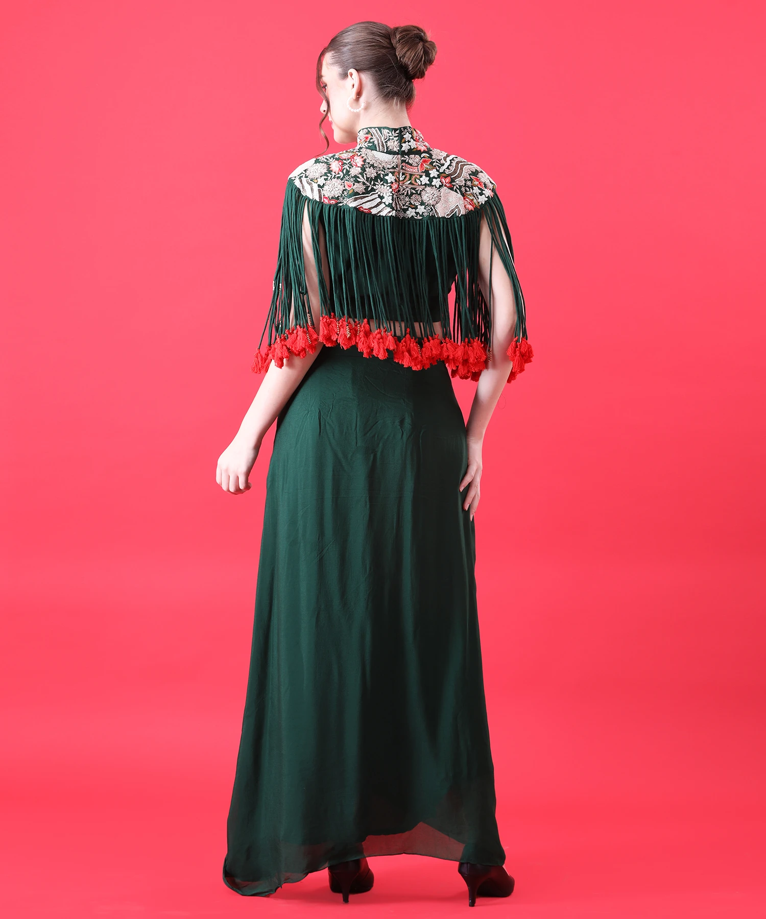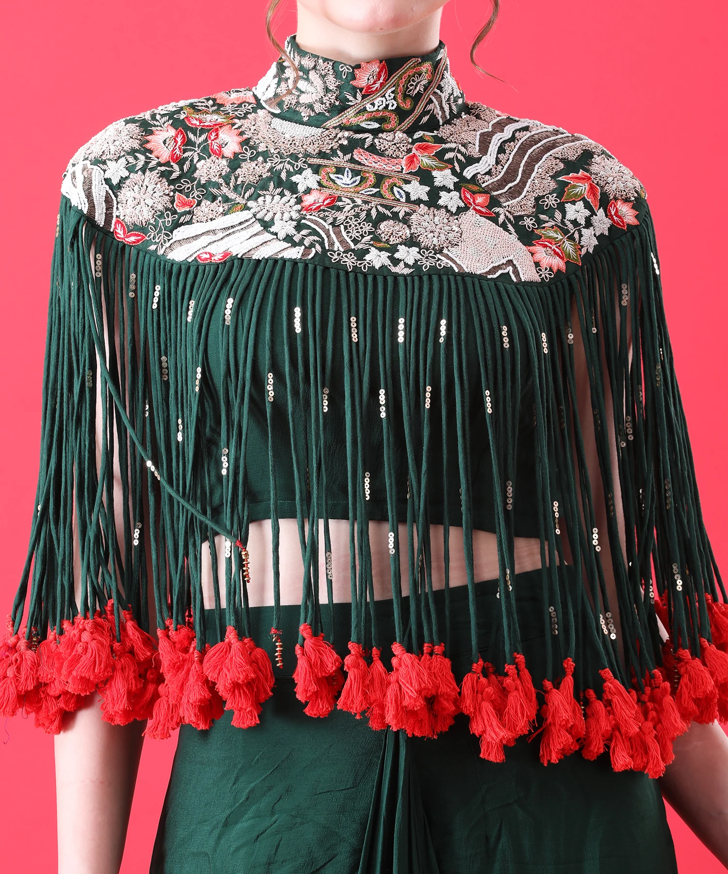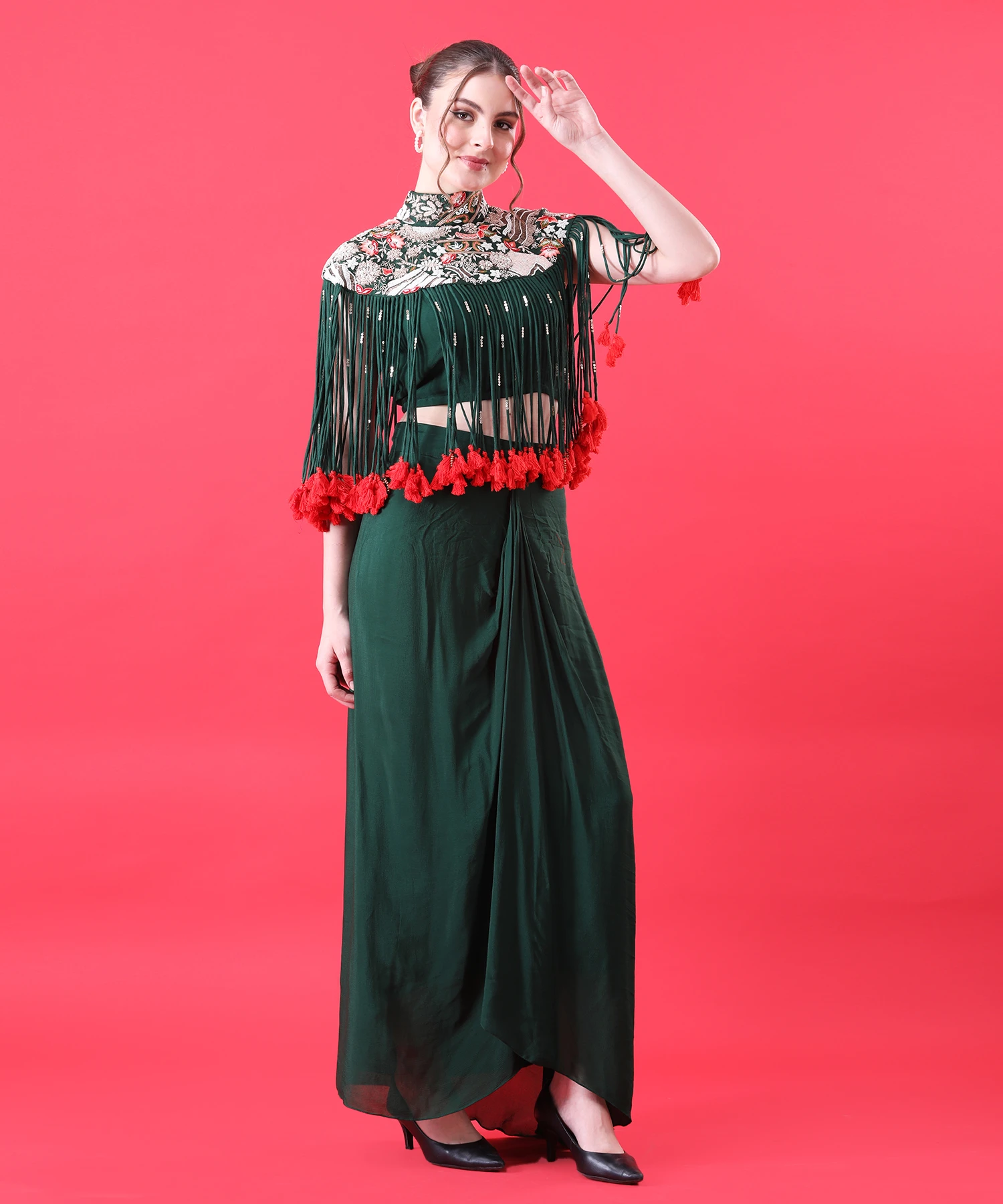 Make every entrance unforgettable with this Emerald Green Cape Set! The silk cape is a work of art, adorned with intricate Zardosi and thread hand embroidery, finished with long, playful tassels that sway with your every move. Paired with a chic crape crop top and a flowing crape skirt, the set balances elegance with contemporary flair. Ideal for weddings, parties, or festive gatherings, it’s a look that’s both glamorous and comfortable. Radiate confidence, charm, and sophistication effortlessly as you twirl, walk, or pose. With luxurious fabrics and exquisite detailing, this set promises to make you feel as amazing as you look.