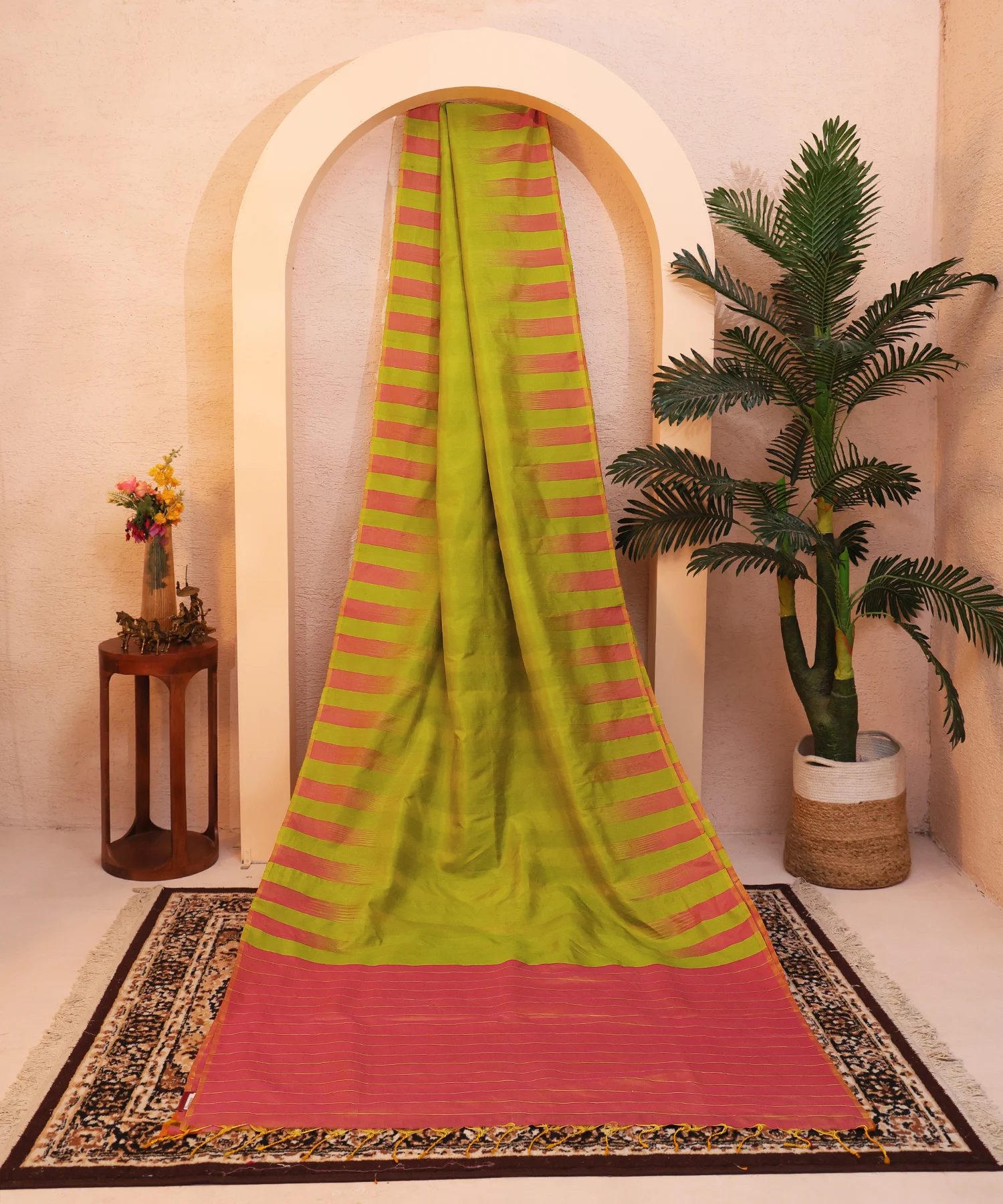 A stunning blend of heritage and modern artistry, this handloom silk saree is crafted to make every moment feel special. The soft pink and pastel yellow hues melt seamlessly into each other, creating a soothing yet vibrant palette that flatters every occasion. Delicate modern weavings across the drape add a fresh, contemporary charm, while the traditional golden zari border grounds the saree in timeless elegance. Lightweight yet regal, it flows with a graceful drape that highlights the beauty of silk in every fold. Perfect for festive gatherings, weddings, or intimate celebrations, this saree is a radiant piece of craftsmanship, designed to let tradition and modernity shine together.