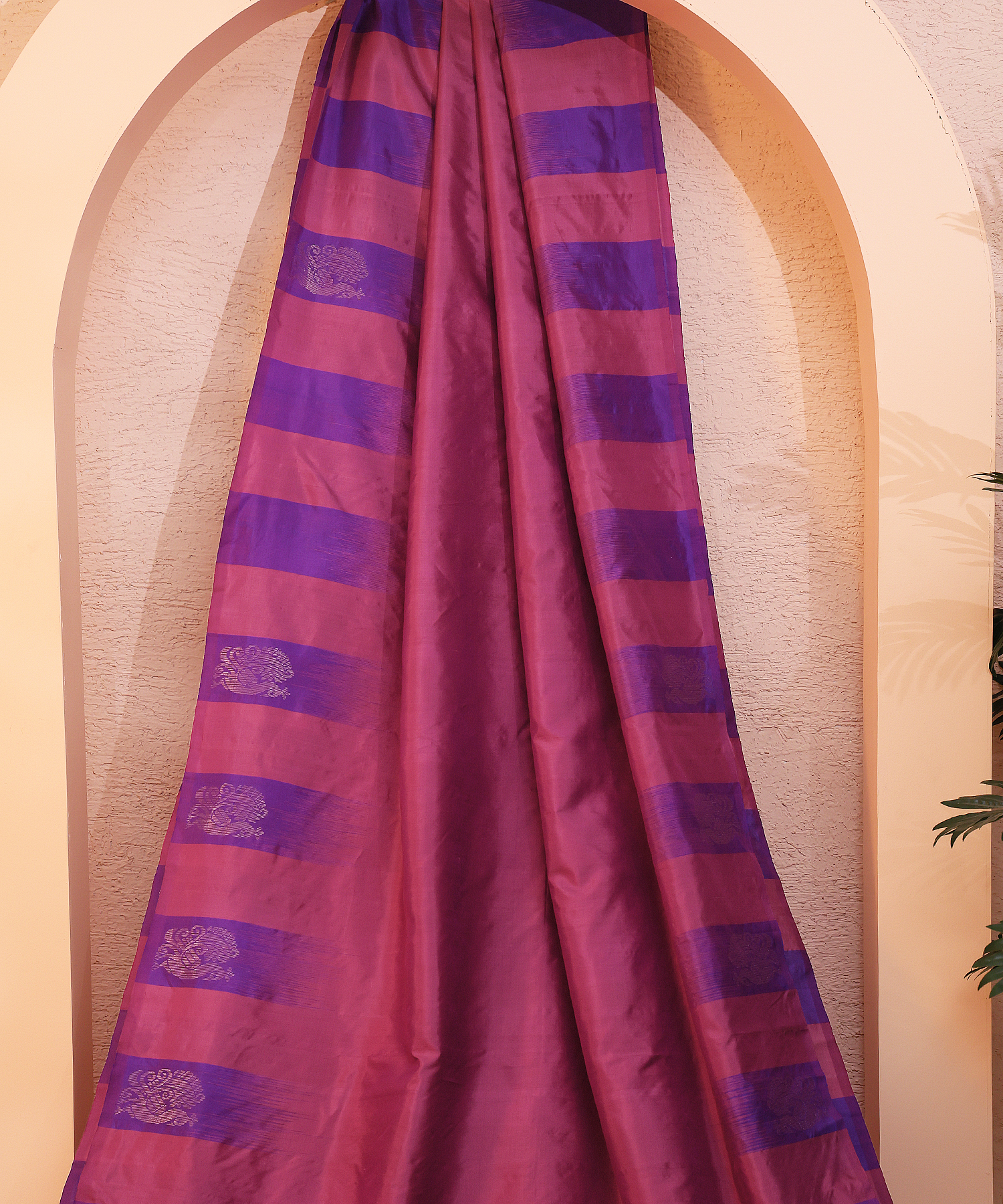 Drape yourself in timeless elegance with this exquisite Handloom Silk Saree in a rich mulberry pink hue. Its luxurious texture is enhanced by a deep dark purple palla that flows gracefully, creating a striking contrast. Intricately woven peacock motifs dance across the fabric, adding a touch of artistic charm and cultural beauty. The classic temple border in golden zari frames the saree, lending it a traditional aura while keeping the design fresh and modern. Perfect for festive celebrations, weddings, or special occasions, this saree blends heritage craftsmanship with contemporary appeal. A statement piece for every wardrobe, it celebrates Indian artistry in the most graceful way.