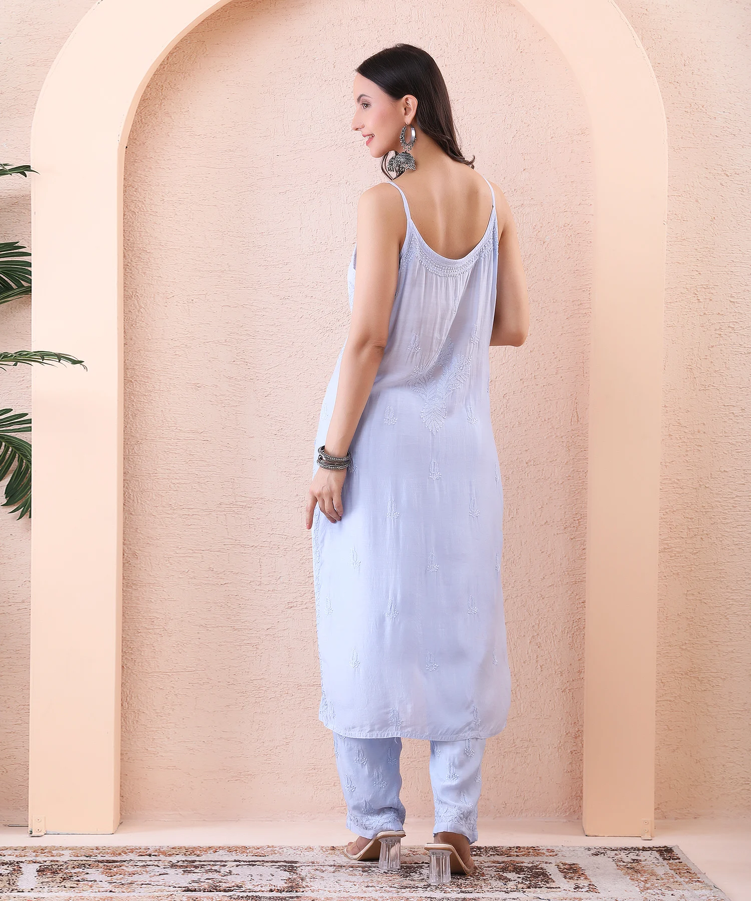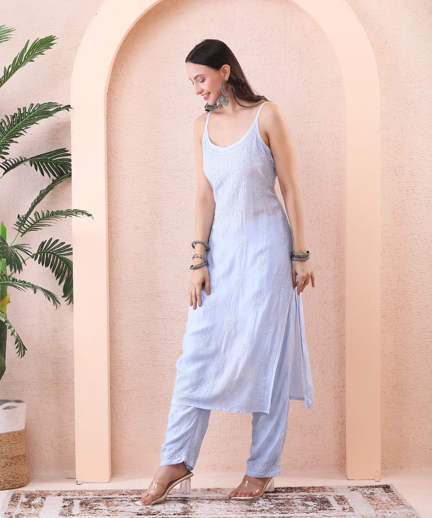 Adorn yourself in the delicate artistry of our Powder Blue Kurta Set. The airy, noodle-strap kurta is a canvas of intricate Chikan hand embroidery, each stitch a testament to traditional skill and modern grace. The lightweight fabric drapes beautifully, while the expertly crafted, matching Chikan embroidered pants offer both style and comfort. This serene powder blue shade is a vision of understated beauty, making this set a versatile addition for any occasion, from a relaxed get-together to a more formal affair. Step out in this one-of-a-kind ensemble that combines timeless heritage with effortless contemporary fashion. |
