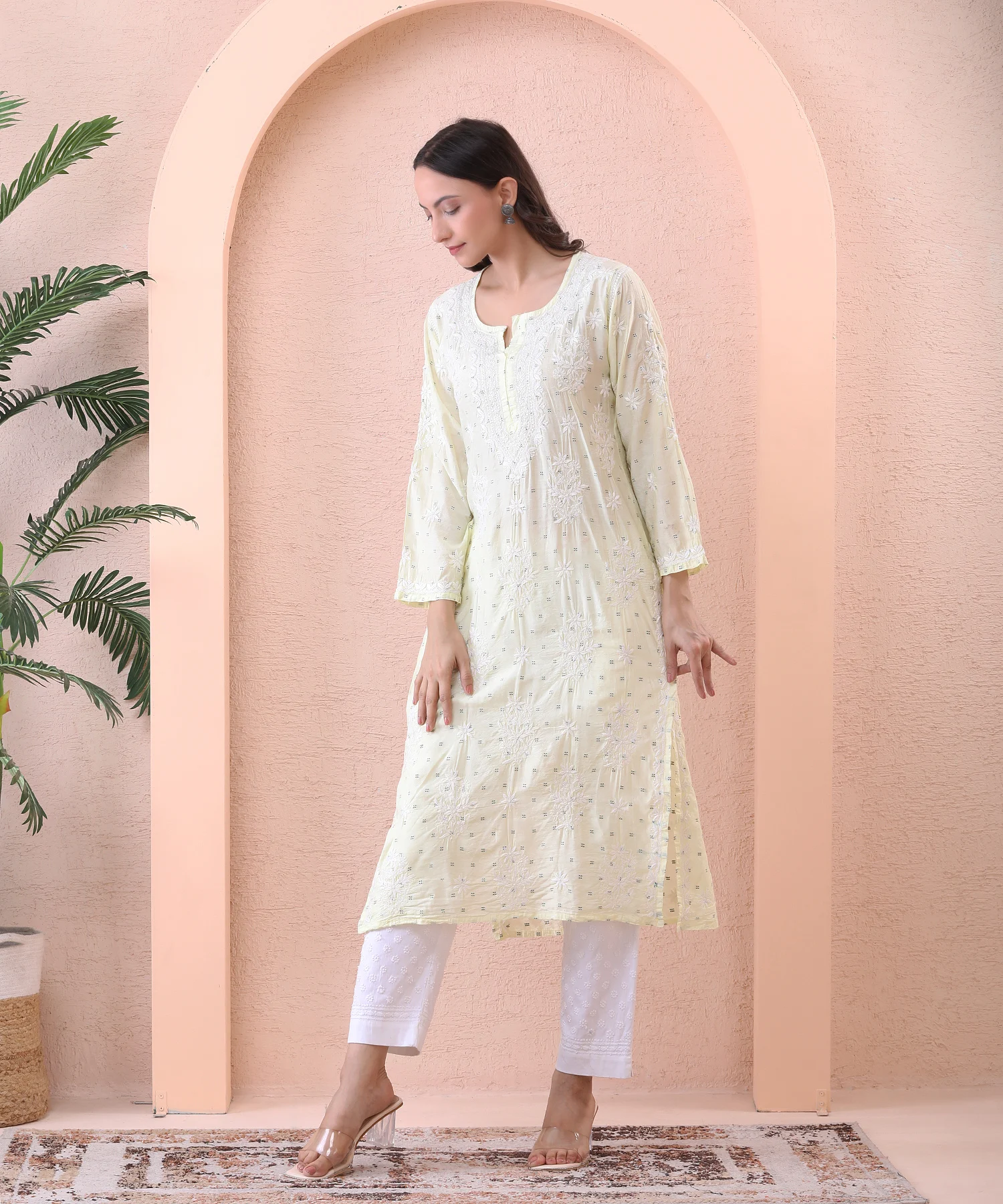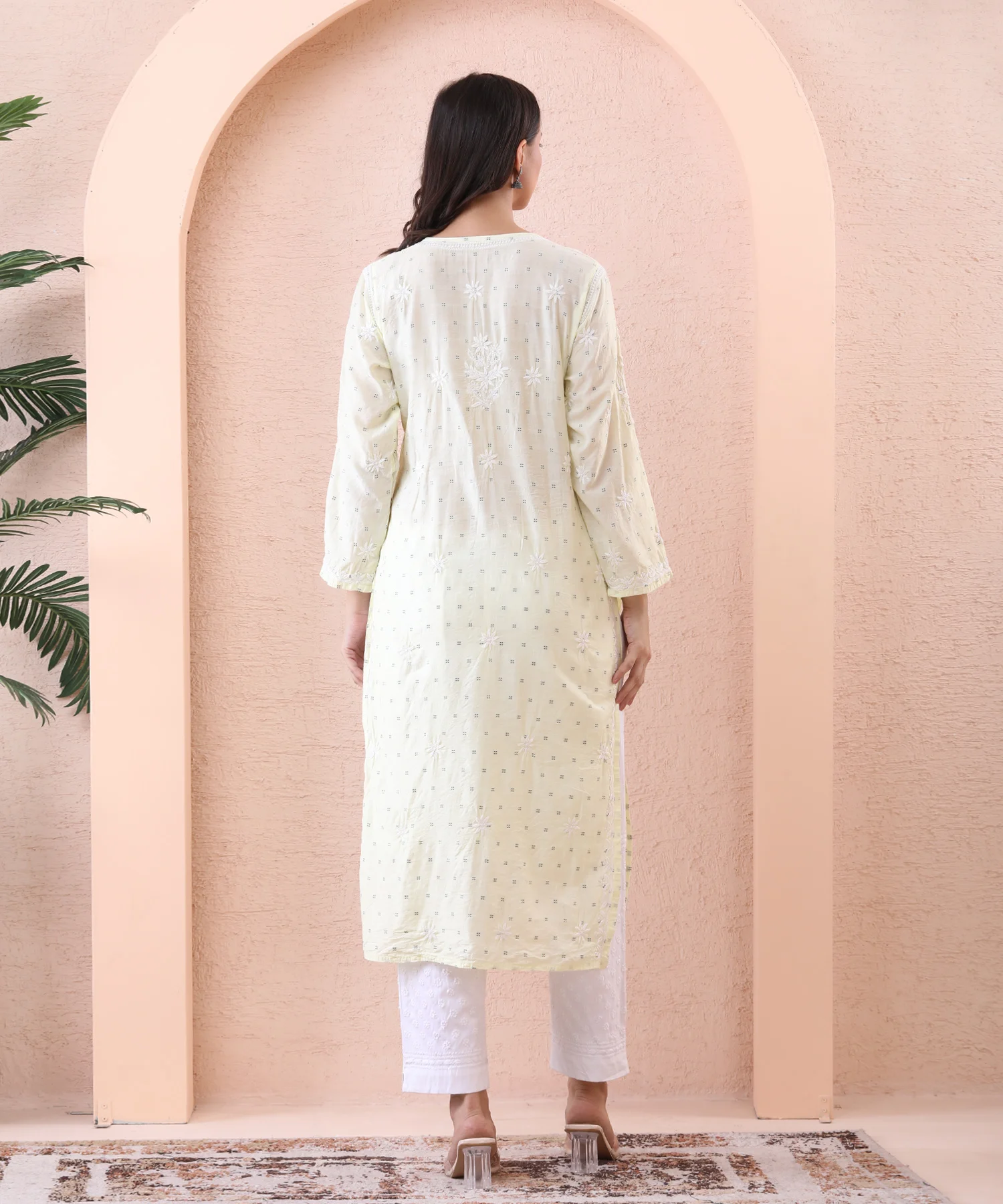 Lime yellow Chanderi Kurti with Chikan Embroidery