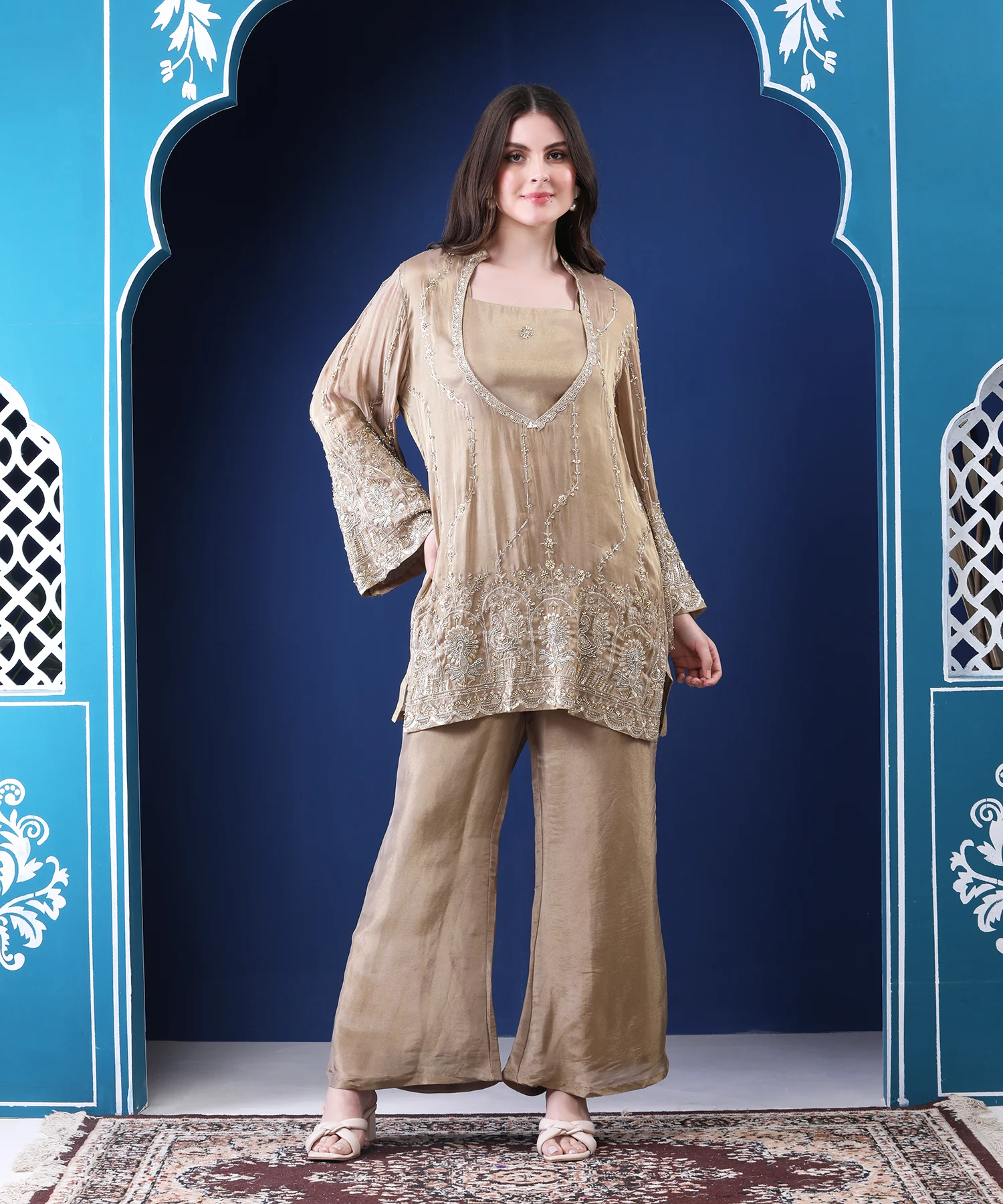 Lite Golden Three Piece Co-ord Set with Hand Embroidered