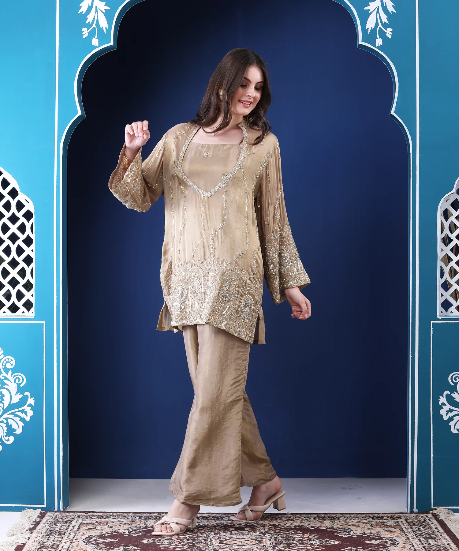 Shimmer with grace in this enchanting three-piece coord set, crafted from luxurious tissue fabric that catches the light beautifully. The hand-embroidered top features intricate sequence and pipe detailing, enhanced by a deep round neckline with a chic stand collar, radiating elegance at every turn. A delicate crop top with tiny bootis embroidery sits underneath, adding subtle charm and layered sophistication. The slightly flared plazzo flows effortlessly, giving a contemporary twist to classic style while ensuring comfort and poise. Bathed in a soft light golden hue, this set is perfect for festive celebrations, parties, or special occasions, offering a harmonious blend of modern design and timeless glamour.