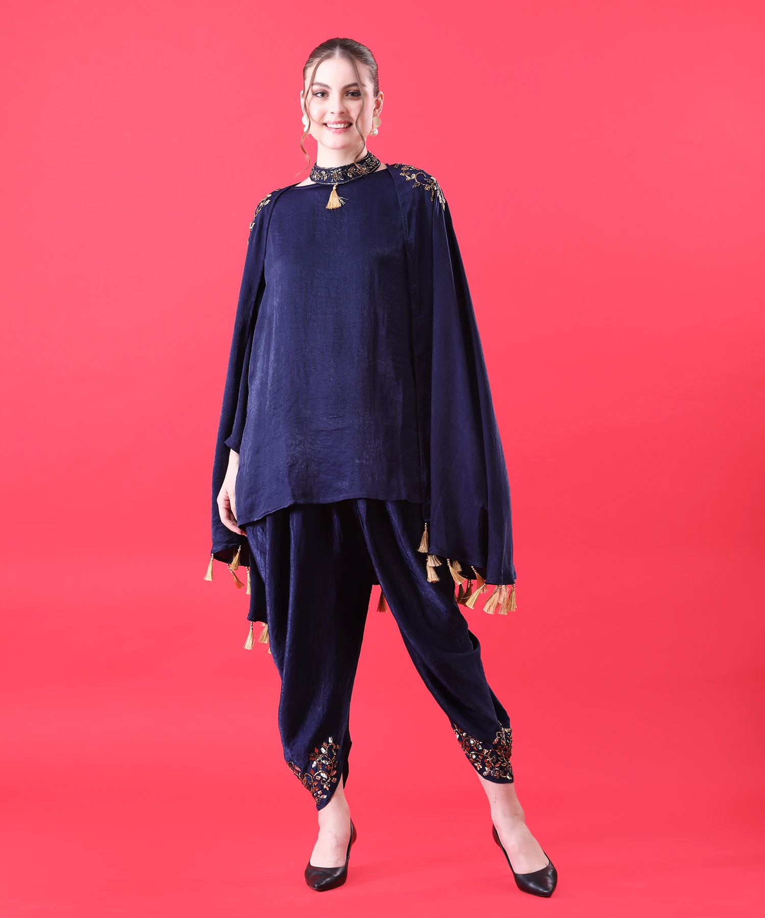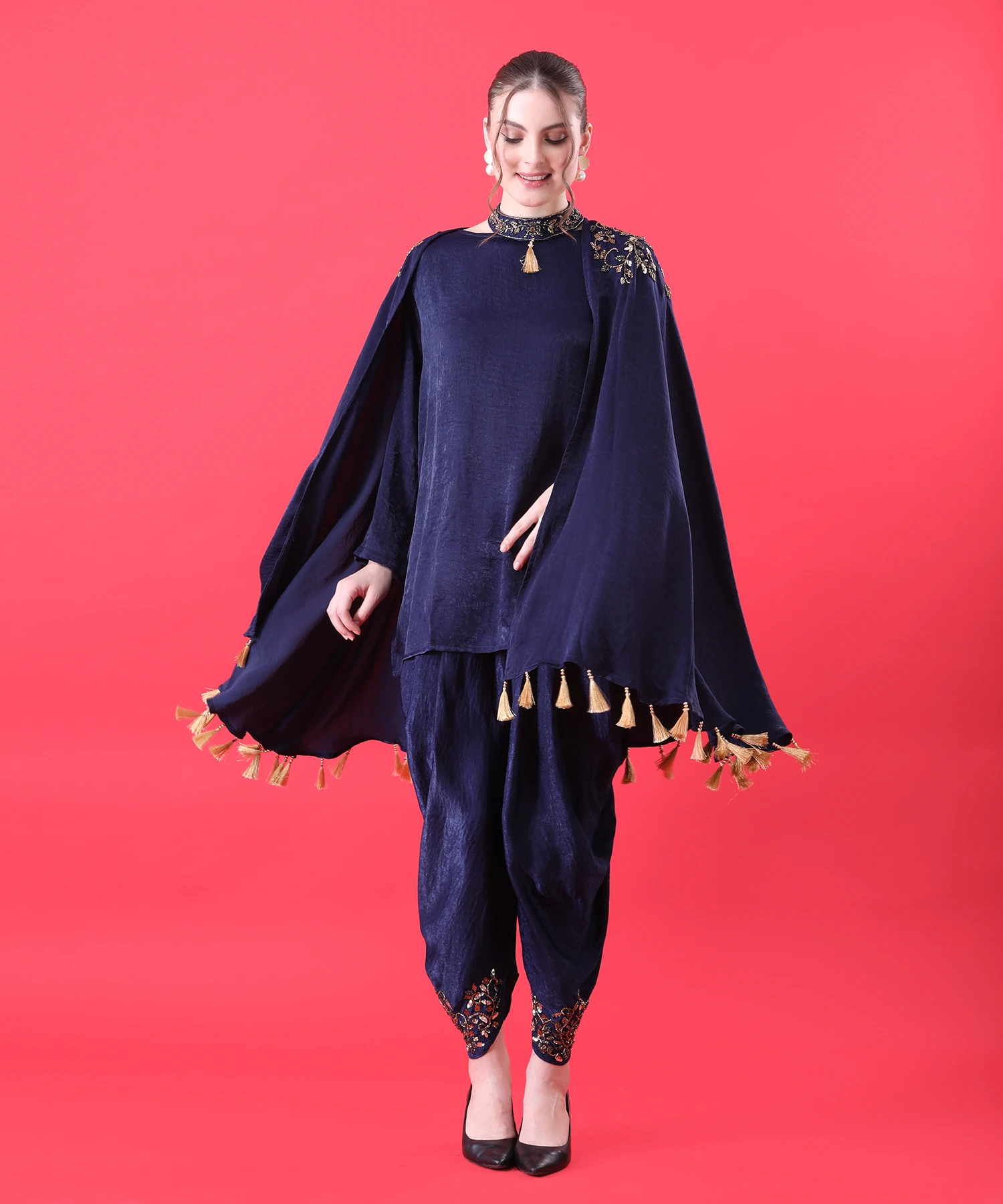 Reimagine chic with this navy-blue three-piece co-ord set in imported jacquard crape. The plain top and comfy dhoti pants offer a modern base, while the detachable cape adds drama and versatility, letting you switch up your style effortlessly. Sparkling hand embroidery with sequins and piping highlights the cape’s shoulders and pants’ bottoms, giving a playful nod to artisanal detail. Perfect for celebrations or evening outings, this ensemble balances comfort, style, and creativity, letting you make a statement without saying a word.