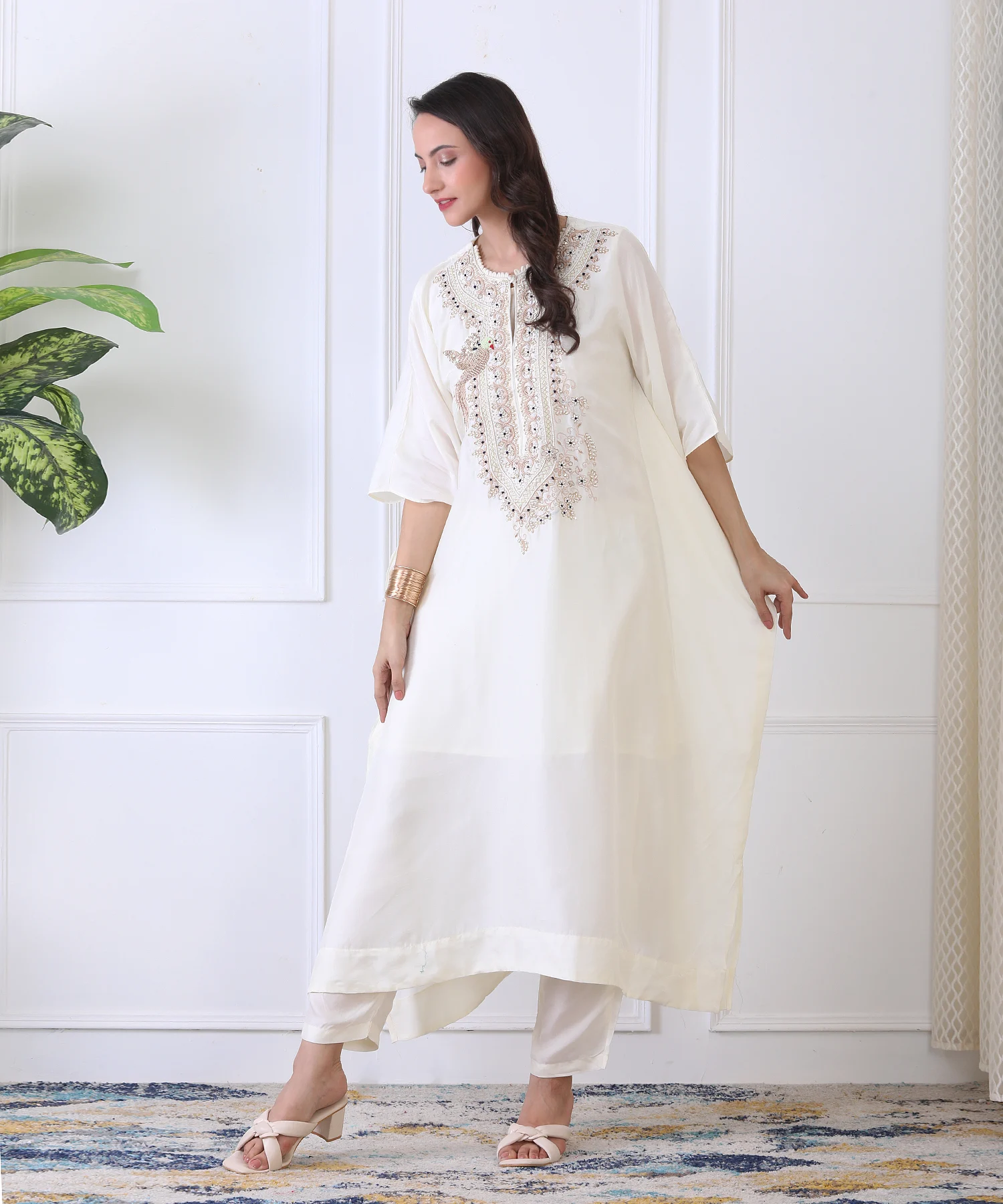 Make every occasion memorable in this Off-White Silk Kaftan Co-ord Set. The luxurious kaftan is adorned with delicate Zardozi hand embroidery along the neckline, reflecting timeless artistry and elegance. Paired with tailored straight pants, it creates a harmonious look that is both stylish and comfortable. Perfect for festive events, social gatherings, or a sophisticated evening out, this set flows gracefully, highlighting your poise and confidence. Soft, elegant, and exquisitely detailed, it’s a celebration of craftsmanship and contemporary design. Step in, shine, and let the subtle shimmer of embroidery speak volumes about your refined taste.