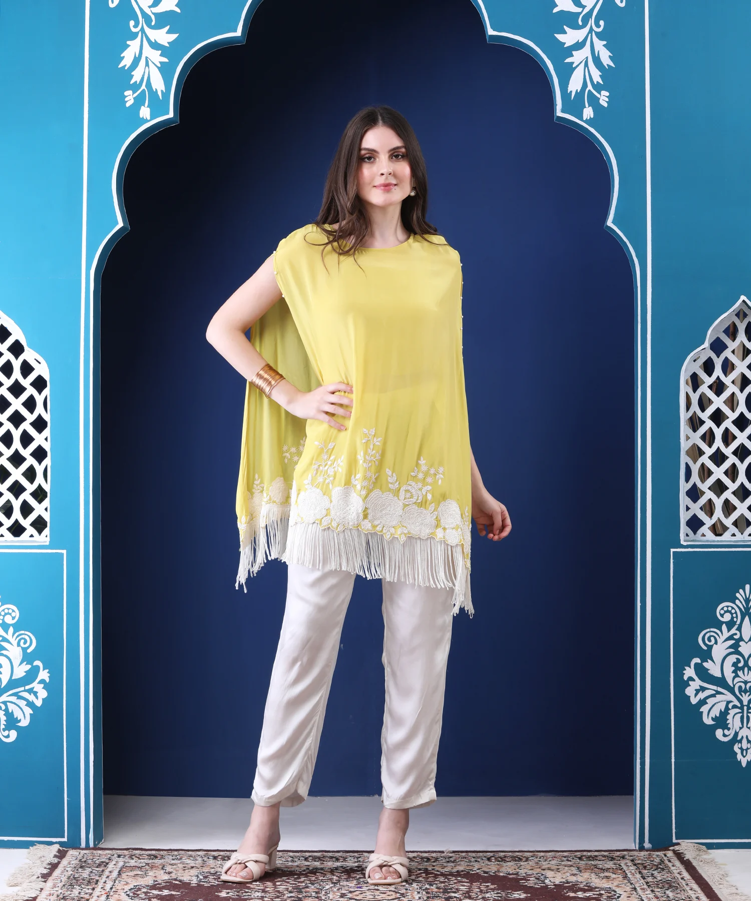 Add some sunshine to your wardrobe with this Pastel Yellow Crape Kaftan Co-ord Set. The flowing kaftan boasts elaborate thread and bead embroidery, topped with tassel lace that sways with each motion. Accompanied by a slim crop top and straight trousers, this set balances comfort with sophisticated elegance. The pale pastel color radiates freshness and tranquility, ideal for celebratory brunches, daytime events, or relaxed celebrations. Created for the cosmopolitan woman who adores effortless chic, this outfit brings a touch of subtle shine and elegant flair, transforming everyday moments into chic statements that exude warmth and charm.