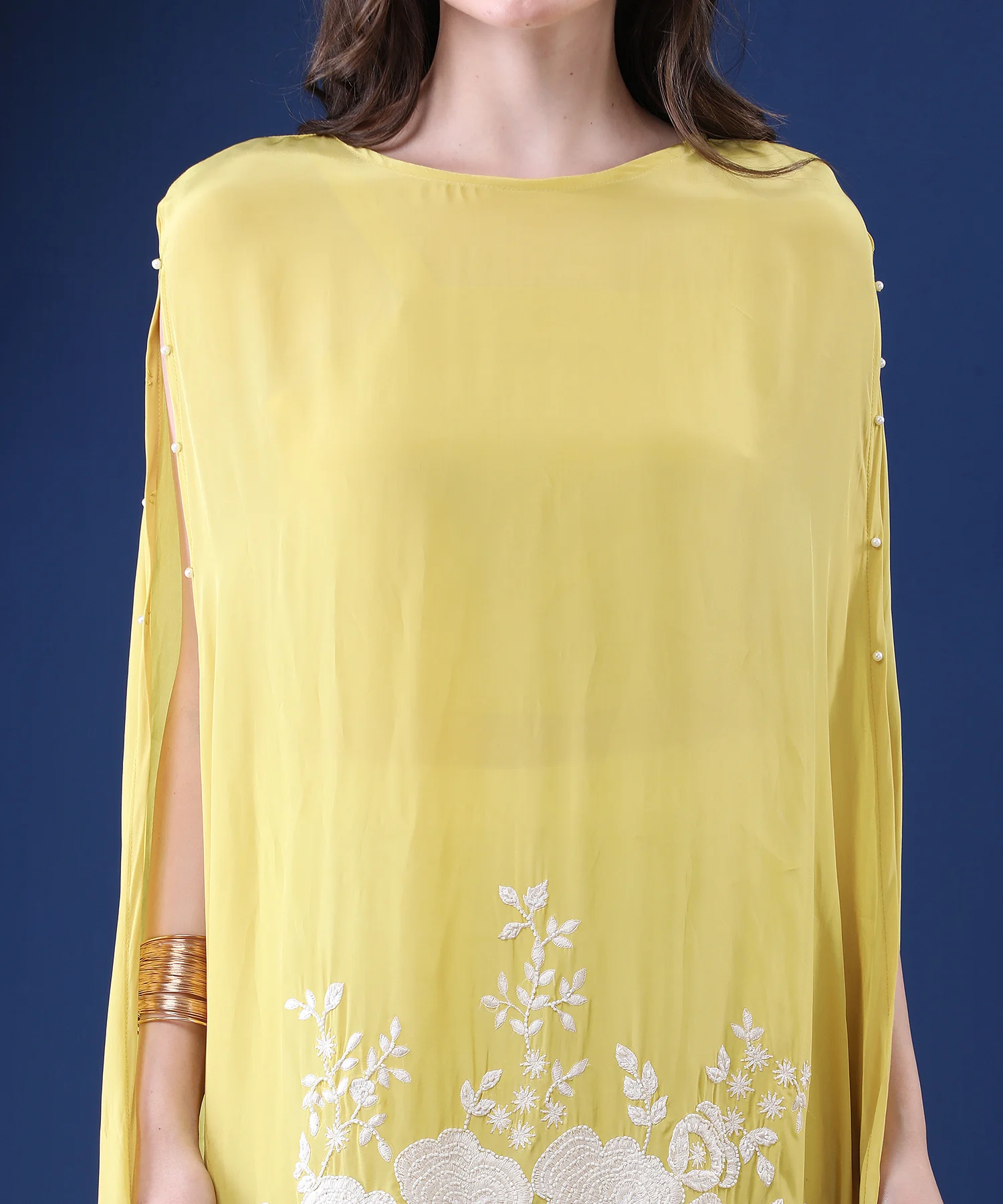 Pastel Yellow Crape Kaftan Co-ord Set with Bead Embroidery