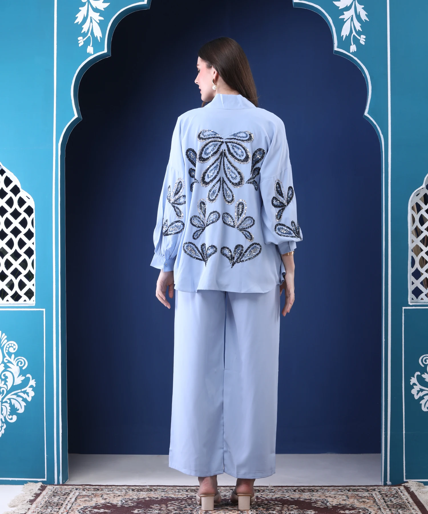 Powder Blue Three-Piece Co-ord Set with Sequin Handwork Shrug