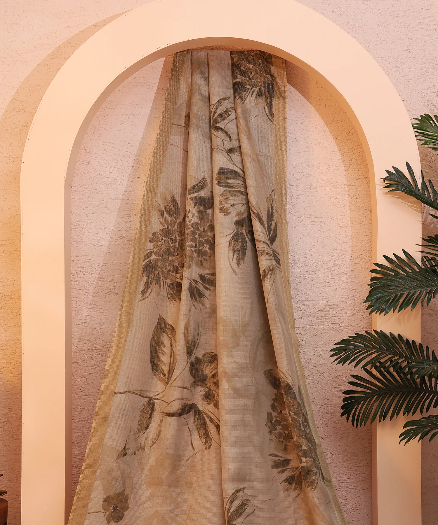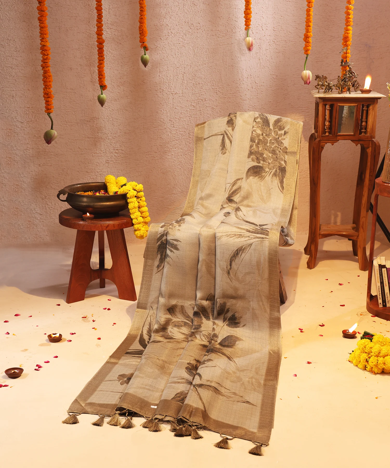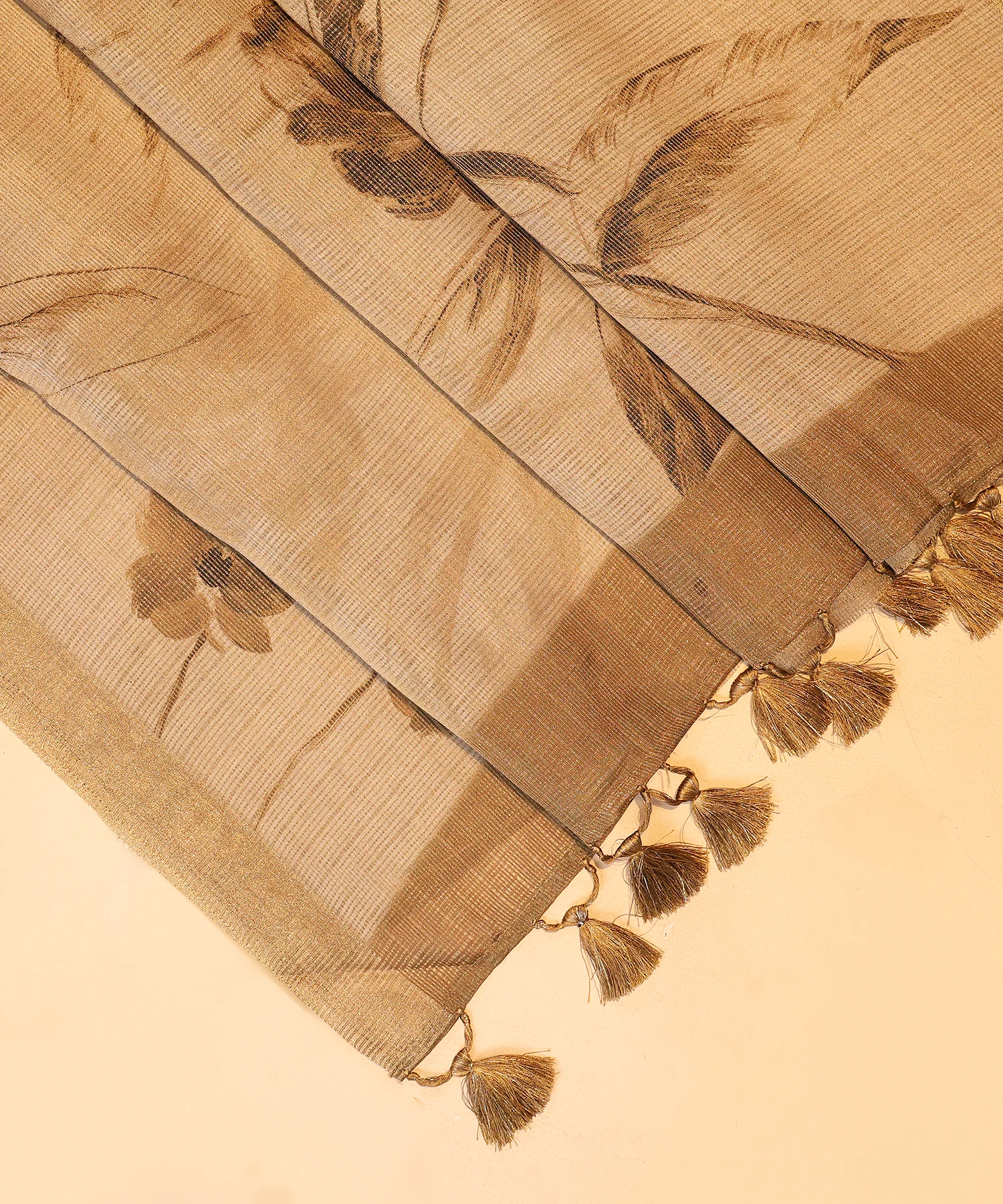 Saree with Floral Digital Print in Beige and Brown and Tassles Pallu