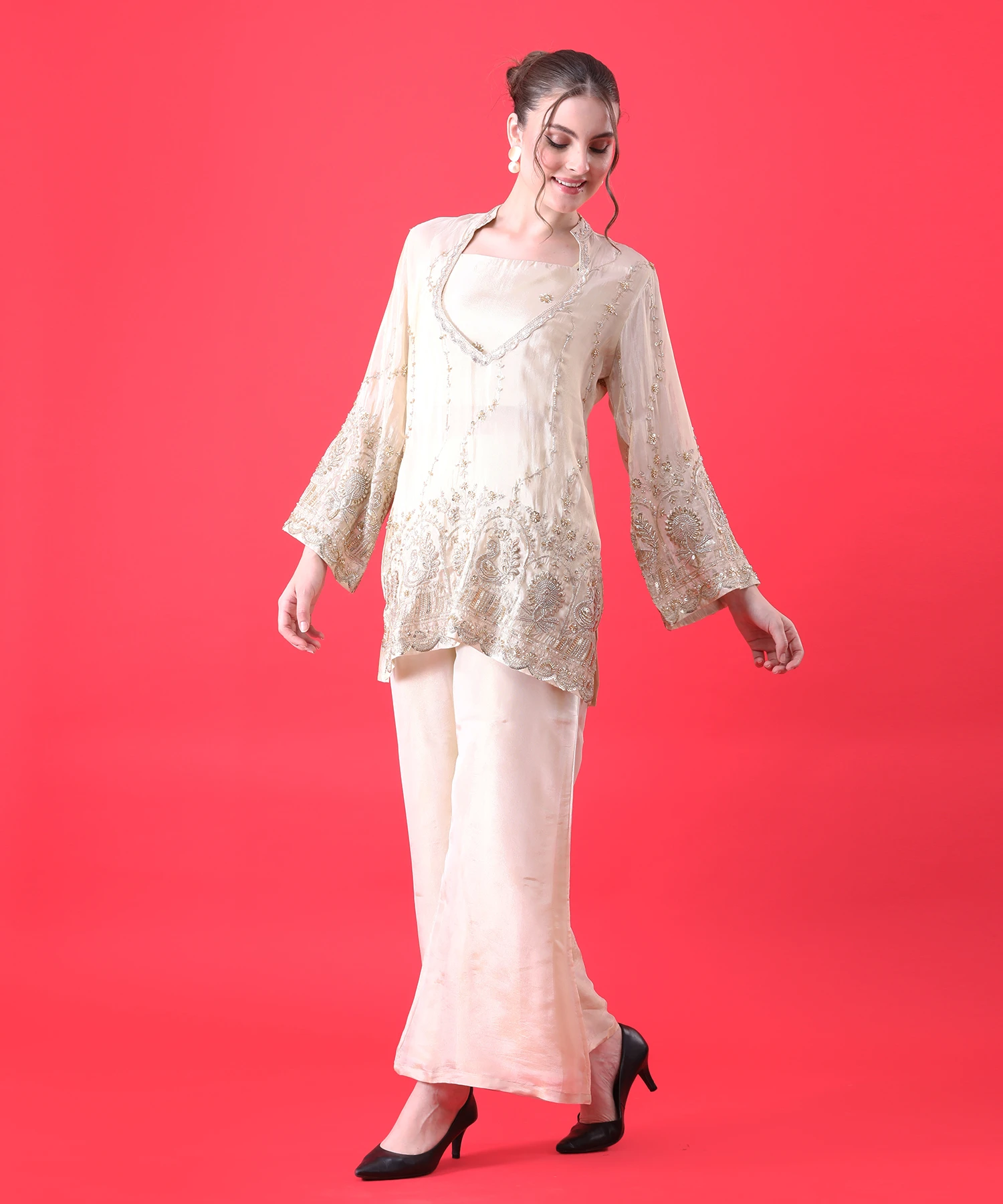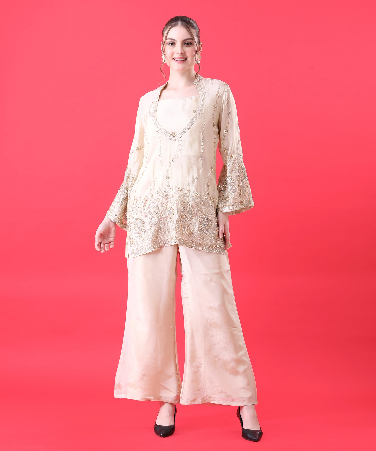 THREE PIECE CO-ORD SET IN SHIMMER TISSUE.BEAUTIFUL HAND EMBROIDERED TOP WITH SEQUENCE AND PIPE WORK AND DEEP ROUND NECK LINE WITH STAND. CROP TOP TO WEAR INSIDE IT WITH SMALL BOOTI EMBROIDERED ON IT .PAIRED WITH SLIGHT FLARED PLASSO
