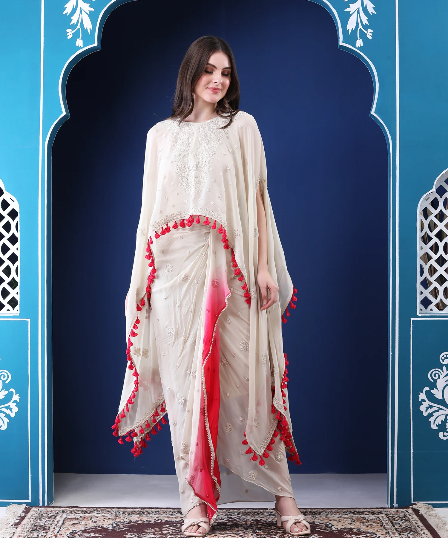 White Pink Cape Set in Georgette with Dhoti Skirt