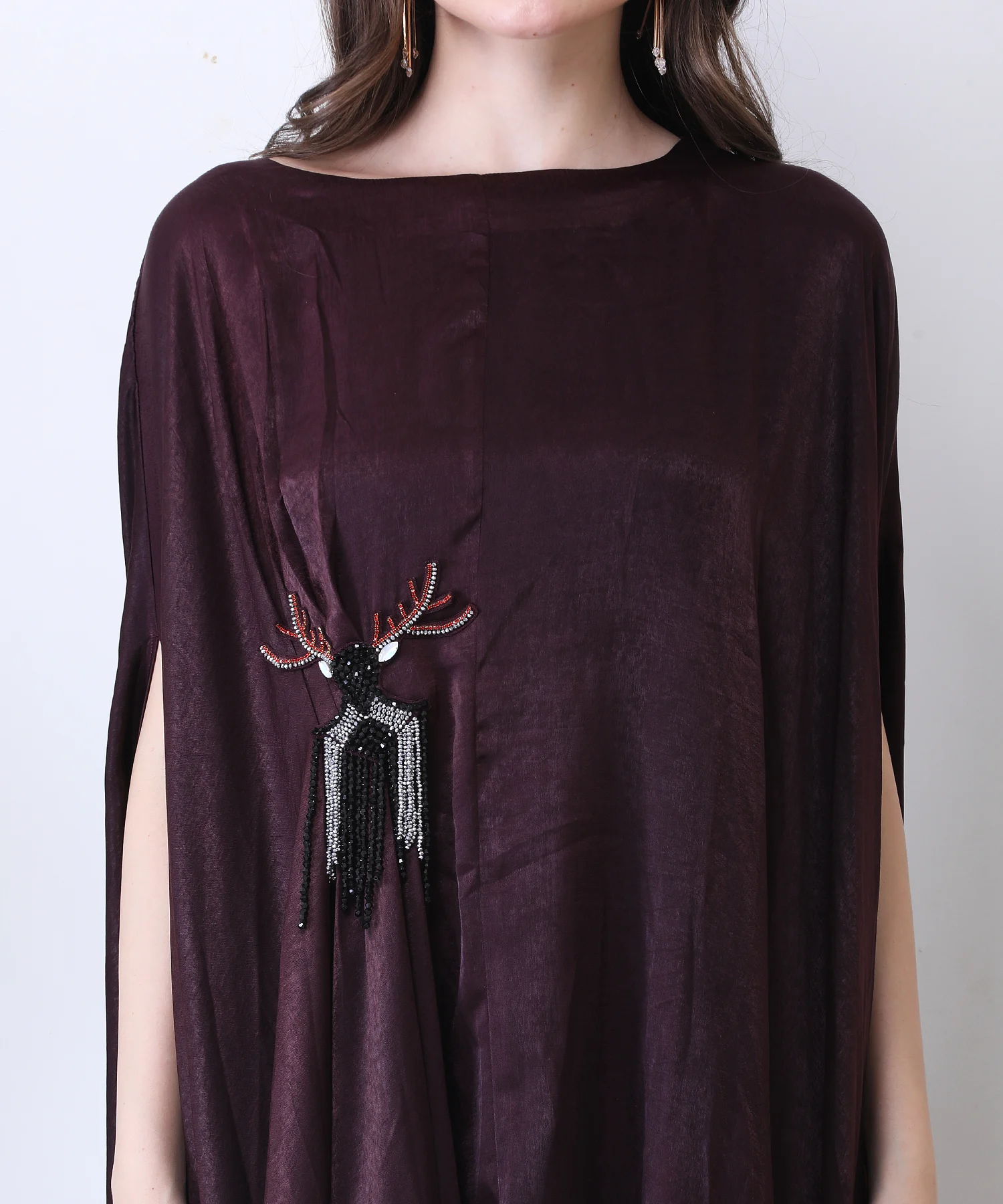 Immerse yourself in the richness of wine with this enchanting kaftan dress in lavish satin crepe. Its flowing cowl drape moves like a gentle river of elegance, while the intricate hand-embroidered motif at the centre becomes the heart of every gaze. Designed for those who wish to make an unforgettable entrance, this kaftan blends timeless sophistication with effortless comfort. Perfect for glamorous evenings, festive celebrations, or moments when you simply want to feel extraordinary, it turns every step into a statement. More than a dress, it’s a celebration of artistry, grace, and confidence, an emblem of style that lingers in memory long after you leave the room.